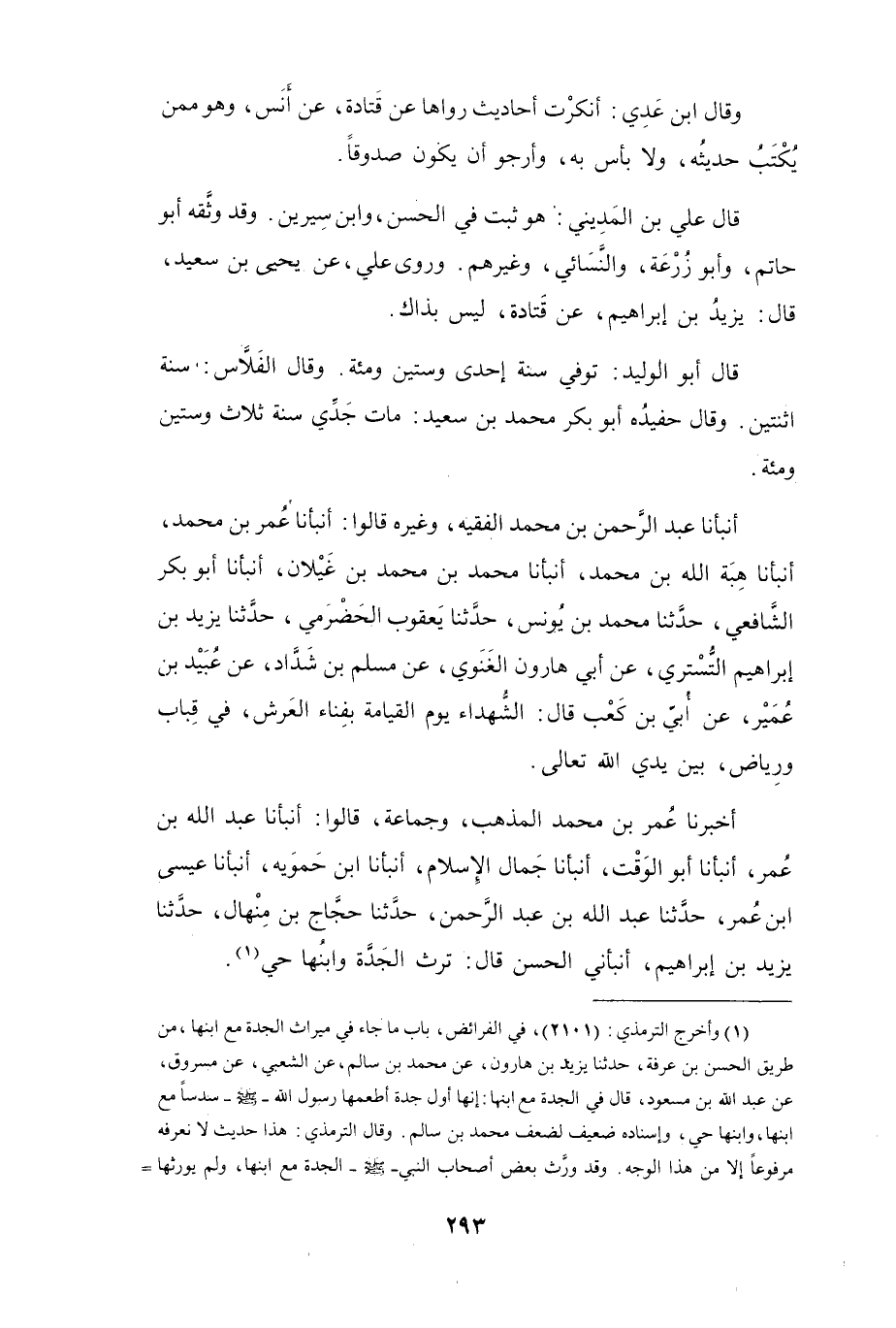 أَنْبَأَنَا عَبْدُ اللهِ بنُ عُمَرَ، أَنْبَأَنَا أَبُو الوَقْتِ، أَنْبَأَنَا جَمَالُ الإِسْلاَمِ، أَنْبَأَنَا ابْنُ حَمُّوَيْه، أَنْبَأَنَا عِيْسَى بنُ عُمَرَ، حَدَّثَنَا عَبْدُ اللهِ بنُ عَبْدِ الرَّحْمَنِ، حَدَّثَنَا حَجَّاجُ بنُ مِنْهَالٍ، حَدَّثَنَا يَزِيْدُ بنُ إِبْرَاهِيْمَ، أَنْبَأَنِي الحَسَنُ، قَالَ: تَرِثُ الجَدَّةُ وَابْنُهَا حَيٌّ (1) .