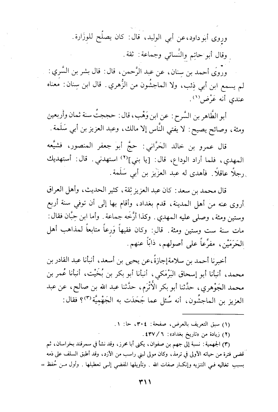 أَخْبَرَنَا أَحْمَدُ بنُ سَلاَمَةَ إِجَازَةً، عَنْ يَحْيَى بنِ أَسَعْدَ، أَنْبَأَنَا عَبْدُ القَادِرِ بنُ مُحَمَّدٍ، أَنْبَأَنَا أَبُو إِسْحَاقَ البَرْمَكِيُّ، أَنْبَأَنَا أَبُو بَكْرٍ بنُ بُخَيْتٍ، أَنْبَأَنَا عُمَرُ بنُ مُحَمَّدٍ الجَوْهَرِيُّ، حَدَّثَنَا أَبُو بَكْرٍ الأَثْرَمُ، حَدَّثَنَا عَبْدُ اللهِ بنُ صَالِحٍ، عَنْ عَبْدِ العَزِيْزِ بنِ المَاجَشُوْنِ: أَنَّهُ سُئِلَ عَمَّا جَحَدَتْ بِهِ الجَهْمِيَّةُ (3) ؟ فَقَالَ: