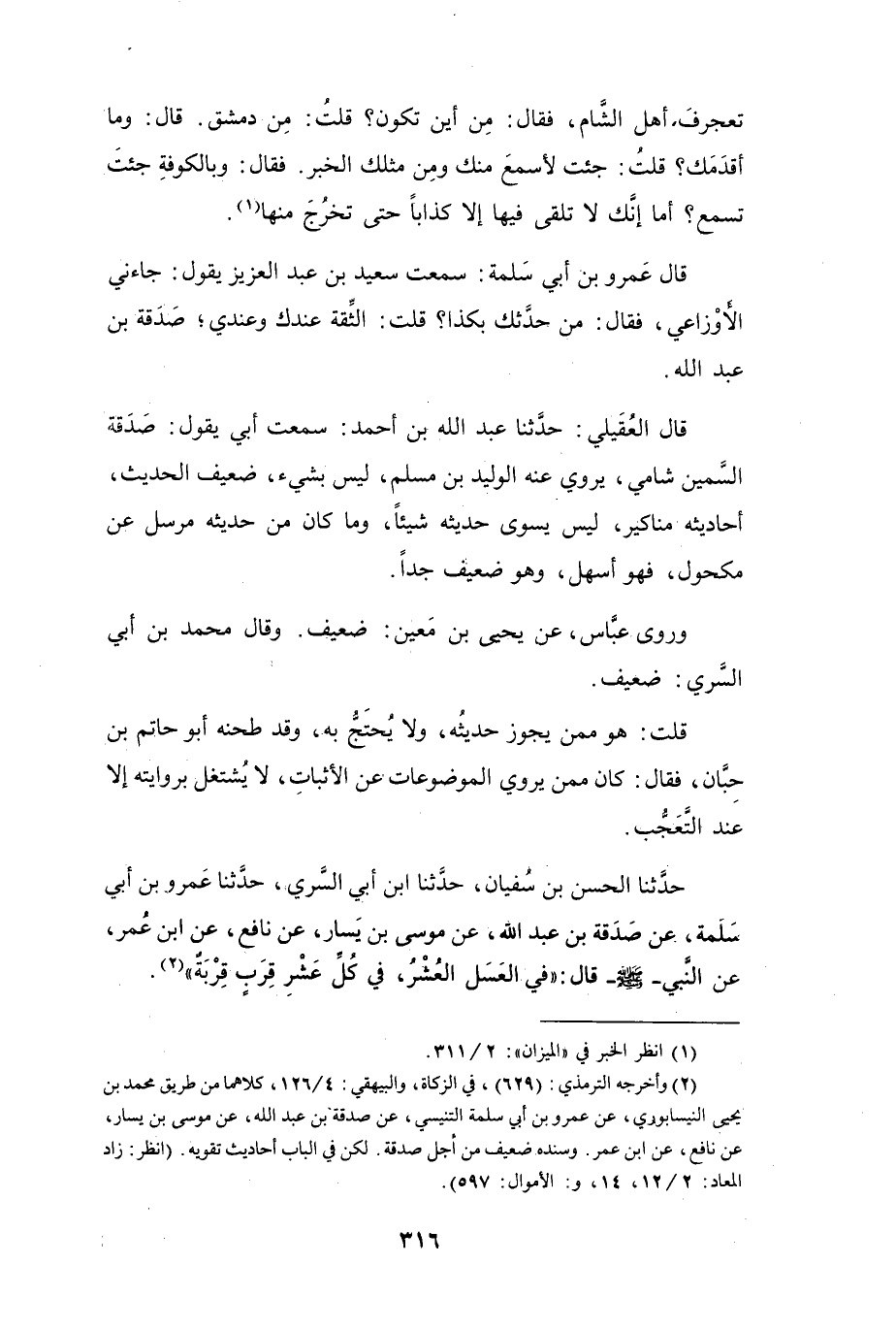 صَدَقَةُ السَّمِيْنُ شَامِيٌّ، يَرْوِي عَنْهُ الوَلِيْدُ بنُ مُسْلِمٍ، لَيْسَ بِشَيْءٍ، ضَعِيْفُ الحَدِيْثِ، أَحَادِيْثُه مَنَاكِيْرُ، لَيْسَ يَسْوَى حَدِيْثُه شَيْئاً، وَمَا كَانَ مِنْ حَدِيْثِهِ مُرْسَلٌ عَنْ مَكْحُوْلٍ، فَهُوَ أَسهَلُ، وَهُوَ ضَعِيْفٌ جِدّاً.