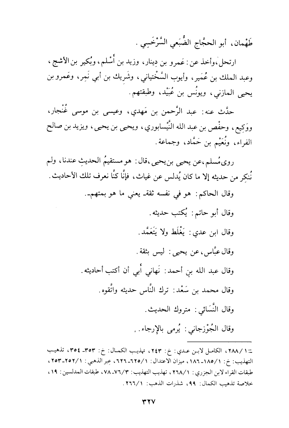 = 1 / 288، الكامل لابن عدي: خ: 243، تهذيب الكمال: خ: 353 - 354، تذهيب التهذيب: خ: 1 / 185 - 186، ميزان الاعتدال: 1 / 625 - 626، عبر الذهبي: 1 / 252 - 253، طبقات القراء لابن الجزري: 1 / 268، تهذيب التهذيب: ك 3 / 76 - 78، طبقات المدلسين: 19، خلاصة تذهيب الكمال: 99، شذرات الذهب: 1 / 266.