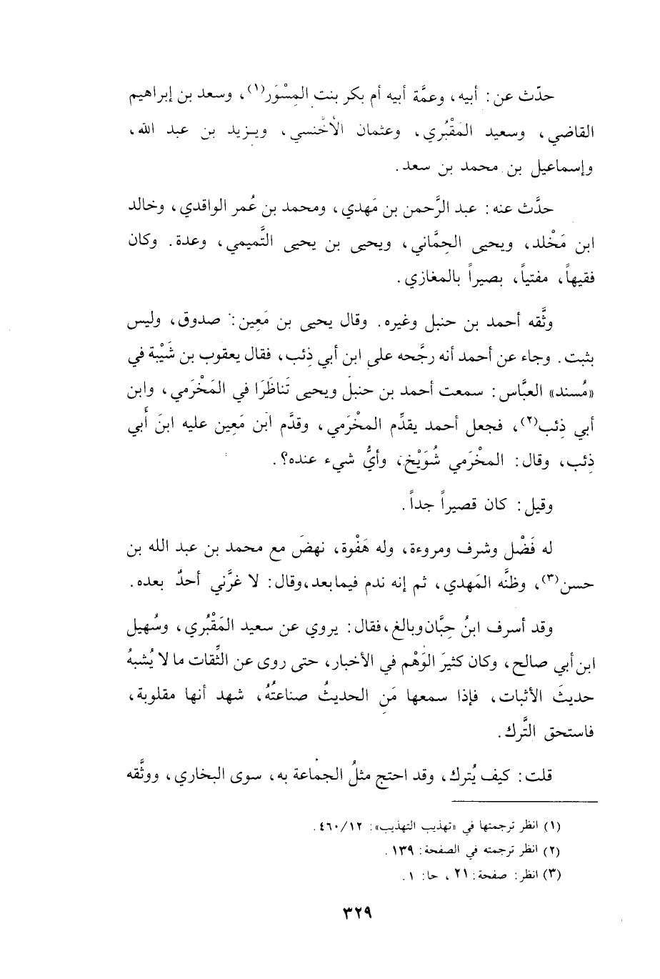 سَمِعْتُ أَحْمَدَ بنَ حَنْبَلٍ، وَيَحْيَى تَنَاظَرَا فِي المَخْرَمِيِّ، وَابْنِ أَبِي ذِئْبٍ (2) ، فَجَعَلَ أَحْمَدُ يُقدِّمُ المَخْرَمِيَّ، وَقَدَّمَ ابْنُ مَعِيْنٍ عَلَيْهِ ابْنَ أَبِي ذِئْبٍ، وَقَالَ: المَخْرَمِيُّ شُوَيْخٌ، وَأَيُّ شَيْءٍ عِنْدَهُ؟