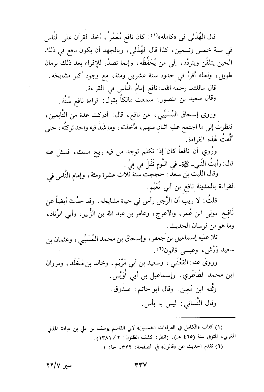قَالَ الهُذَلِيُّ فِي (كَامِلِهِ (1)) : كَانَ نَافِعٌ مُعَمَّراً، أَخَذَ القُرْآنَ عَلَى النَّاسِ فِي سَنَةِ خَمْسٍ وَتِسْعِيْنَ - كَذَا قَالَ الهُذَلِيُّ - وَبِالجهدِ أَنْ يَكُوْنَ نَافِعٌ فِي ذَلِكَ الحِيْنِ يَتلقَّنُ وَيَتردَّدُ إِلَى مَنْ يُحَفِّظُه، وَإِنَّمَا تَصدَّرَ لِلإِقْرَاءِ بَعْدَ ذَلِكَ بِزَمَانٍ طَوِيْلٍ، وَلَعلَّهُ أَقرَأَ فِي حُدُوْدِ سَنَةِ عِشْرِيْنَ وَمائَةٍ، مَعَ وُجُوْدِ أَكْبَرِ مَشَايِخِه.