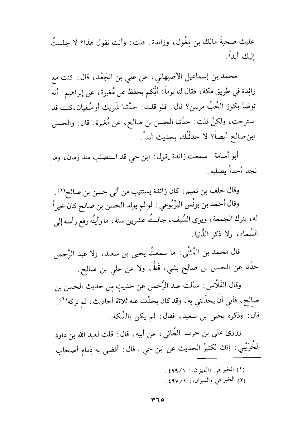 وَقَالَ خَلَفُ بنُ تَمِيْمٍ: كَانَ زَائِدَةُ يَسْتَتِيْبُ مَنْ أَتَى حَسَنَ بنَ صَالِحٍ (1) .