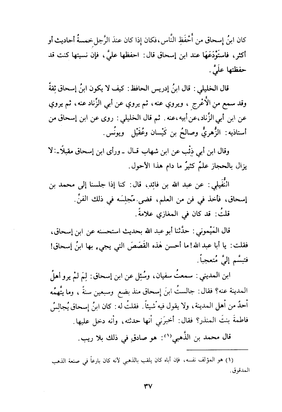 فَقَالَ: جَالَسْتُ ابْنَ إِسْحَاقَ مُنْذُ بِضْعٍ وَسَبْعِيْنَ سَنَةً، وَمَا يَتَّهِمُهُ أَحَدٌ مِنْ أَهْلِ المَدِيْنَةِ، وَلاَ يَقُوْلُ فِيْهِ شَيْئاً.