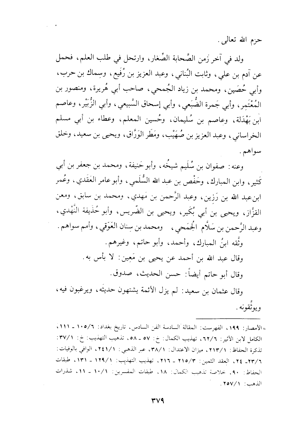 = الأمصار: 199، الفهرست: المقالة السادسة الفن السادس، تاريخ بغداد: 6 / 105 - 111، الكامل لابن الأثير: 6 / 62، تهذيب الكمال: خ: 57 - 58، تذهيب التهذيب: خ: 1 / 37: تذكرة الحفاظ: 1 / 213، ميزان الاعتدال: 1 / 38، عبر الذهبي: 1 / 241، الوافي بالوفيات: 6 / 23 - 24، العقد الثمين: 3 / 215 - 216، تهذيب التهذيب: 1 / 129 - 131، طبقات الحفاظ: 90، خلاصة تذهيب الكمال: 18، طبقات المفسرين: 1 / 10 - 11، شذرات الذهب: 1 / 257.