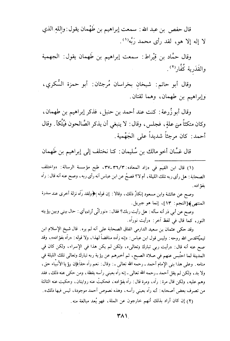 (1) قال ابن القيم في " زاد المعاد ": 3 / 36 - 37، طبع مؤسسة الرسالة: " واختلف الصحابة: هل رأى ربه تلك الليلة، أم لا؟ فصح عن ابن عباس أنه رأى ربه، وصح عنه أنه قال: رآه بفؤاده.