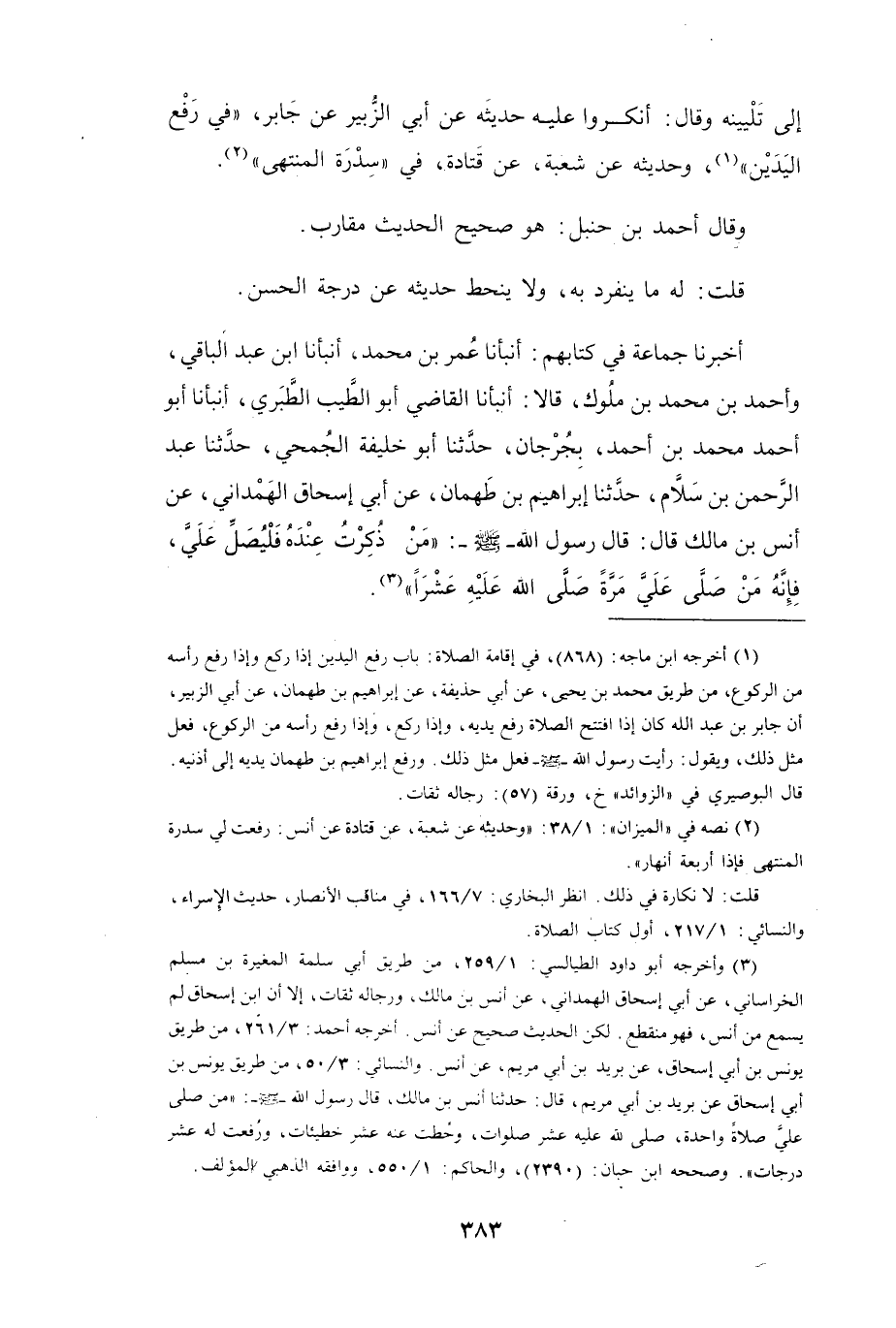 (1) أخرجه ابن ماجه: (868) ، في إقامة الصلاة: باب رفع اليدين إذا ركع وإذا رفع رأسه من الركوع، من طريق محمد بن يحيى، عن أبي حذيفة، عن إبراهيم بن طهمان، عن أبي الزبير، أن جابر بن عبد الله كان إذا افتتح الصلاة رفع يديه، وإذا ركع، وإذا رفع رأسه من الركوع، فعل مثل ذلك، ويقول: رأيت رسول الله - صلى الله عليه وسلم - فعل مثل ذلك.