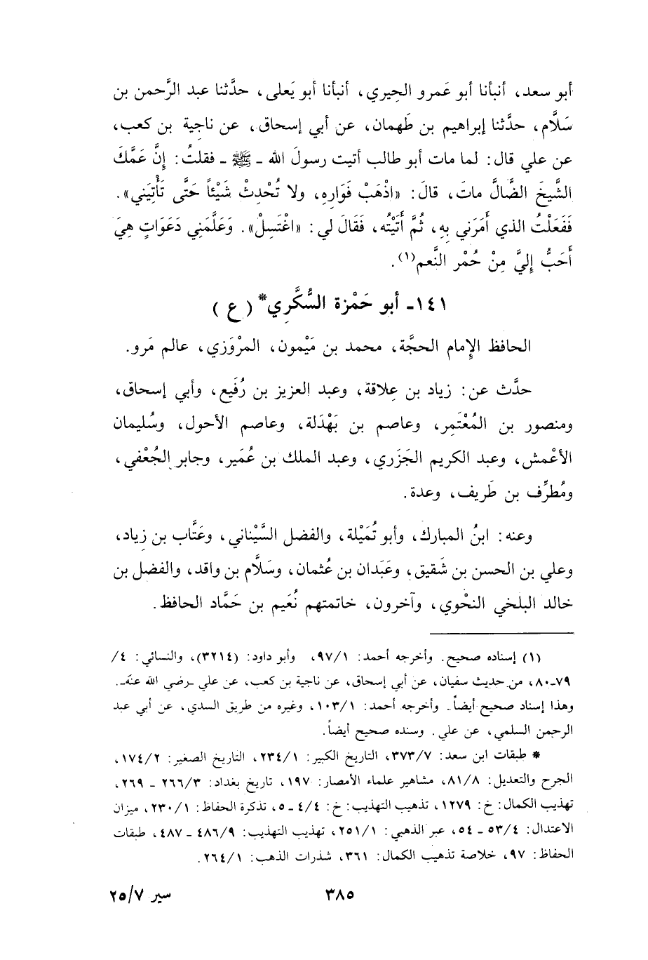 أَبُو سَعْدٍ، أَنْبَأَنَا أَبُو عَمْرٍو الحِيْرِيُّ، أَنْبَأَنَا أَبُو يَعْلَى، حَدَّثَنَا عَبْدُ الرَّحْمَنِ بنُ سَلاَّمٍ، حَدَّثَنَا إِبْرَاهِيْمُ بنُ طَهْمَانَ، عَنْ أَبِي إِسْحَاقَ، عَنْ نَاجِيَةَ بنِ كَعْبٍ، عَنْ عَلِيٍّ، قَالَ: