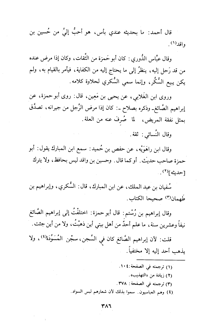 وَقَالَ عَبَّاسٌ الدُّوْرِيُّ: كَانَ أَبُو حَمْزَةَ مِنَ الثِّقَاتِ، وَكَانَ إِذَا مَرِضَ عِنْدَهُ مَنْ قَدْ رَحَلَ إِلَيْهِ، يَنْظُرُ إِلَى مَا يَحتَاجُ إِلَيْهِ مِنَ الكِفَايَة، فَيَأمُرُ بِالقِيَامِ بِهِ، وَلَمْ يَكُنْ يَبِيْعُ السُّكَّرَ، وَإِنَّمَا سُمِّيَ: السُّكَّرِيّ؛ لِحَلاَوَةِ كَلاَمِهِ.