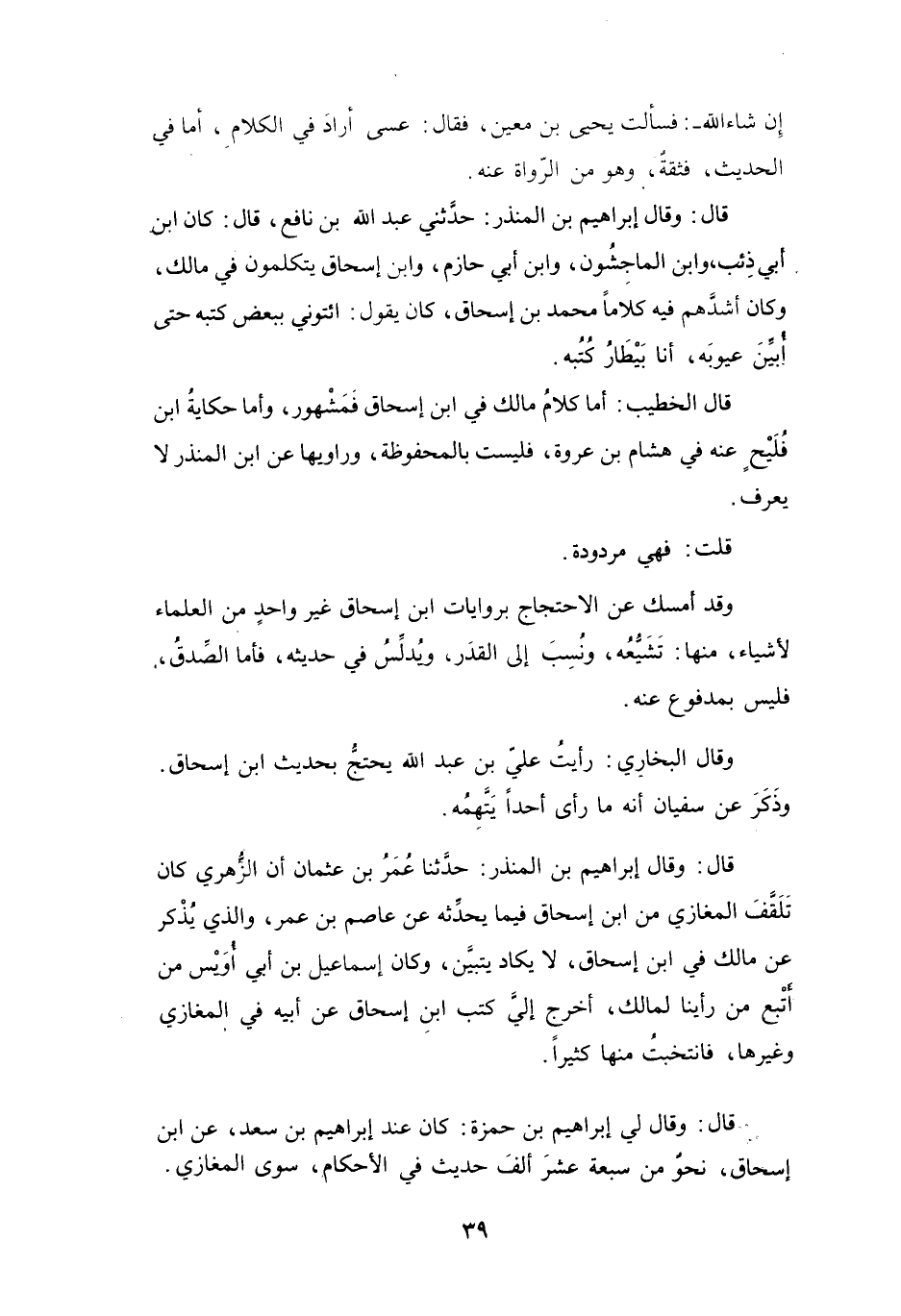 أَنَّ الزُّهْرِيَّ كَانَ تَلَقَّفَ المَغَازِيَ مِنِ ابْنِ إِسْحَاقَ فِيْمَا يُحَدِّثُه عَنْ عَاصِمِ بنِ عُمَرَ، وَالَّذِي يُذكَرُ عَنْ مَالِكٍ فِي ابْنِ إِسْحَاقَ، لاَ يَكَادُ يَتَبَيَّنُ، وَكَانَ إِسْمَاعِيْلُ بنُ أَبِي أُوَيْسٍ مِنْ أَتْبَعِ مَنْ رَأَينَا لِمَالِكٍ، أَخْرَجَ إِلَيَّ كُتُبَ ابْنِ إِسْحَاقَ عَنْ أَبِيْهِ فِي المَغَازِي وَغَيْرِهَا، فَانْتخَبتُ مِنْهَا كَثِيْراً.