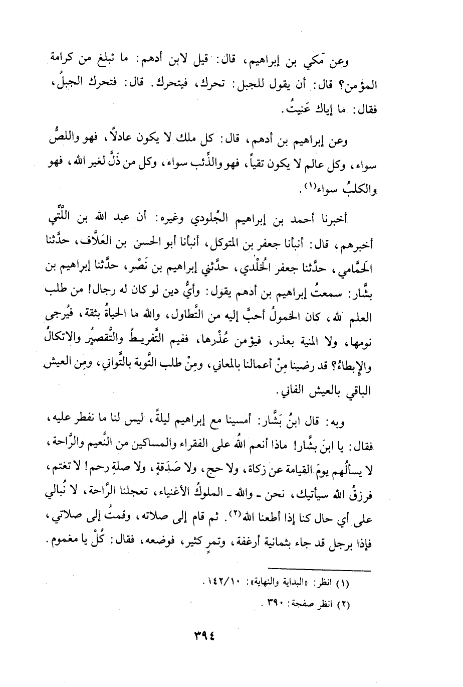 وَعَنْ إِبْرَاهِيْمَ بنِ أَدْهَمَ، قَالَ: كُلُّ مَلِكٍ لاَ يَكُوْنُ عَادِلاً، فَهُوَ وَاللِّصُّ سَوَاءٌ، وَكُلُّ عَالِمٍ لاَ يَكُوْنُ تَقِيّاً، فَهُوَ وَالذِّئْبُ سَوَاءٌ، وَكُلُّ مَنْ ذَلَّ لِغَيْرِ اللهِ، فَهُوَ وَالكَلْبُ سَوَاءٌ (1) .