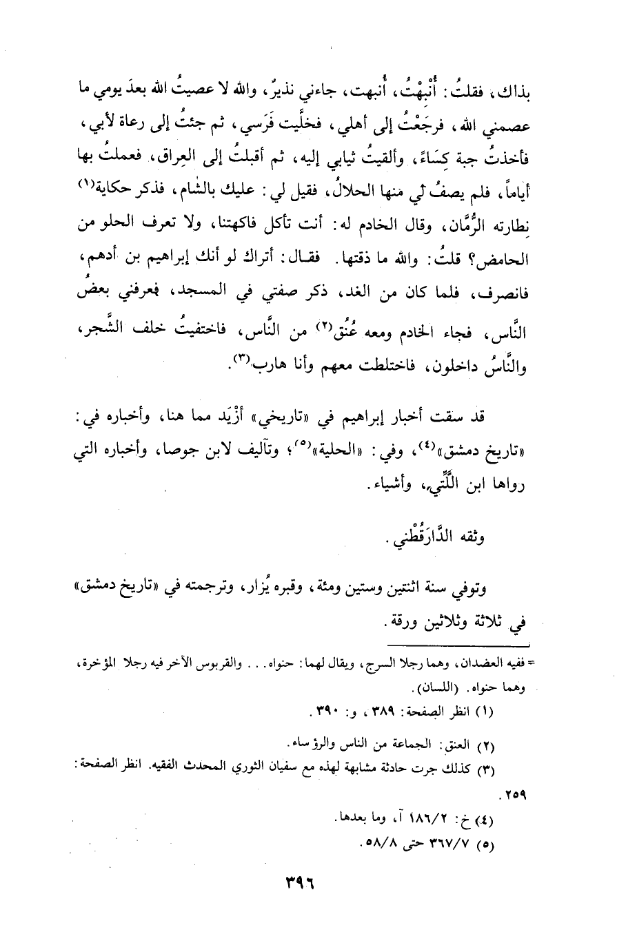 قَدْ سُقْتُ أَخْبَارَ إِبْرَاهِيْمَ فِي (تَارِيْخِي) أَزْيَدَ مِمَّا هُنَا، وَأَخْبَارَهُ فِي: (تَارِيْخِ دِمَشْقَ (4)) وَفِي: (الحِلْيَة (5)) ؛ وَتَآلِيْفَ لابْنِ جَوْصَا، وَأَخْبَارَهُ الَّتِي رَوَاهَا ابْنُ اللَّتِّيِّ، وَأَشْيَاءَ.