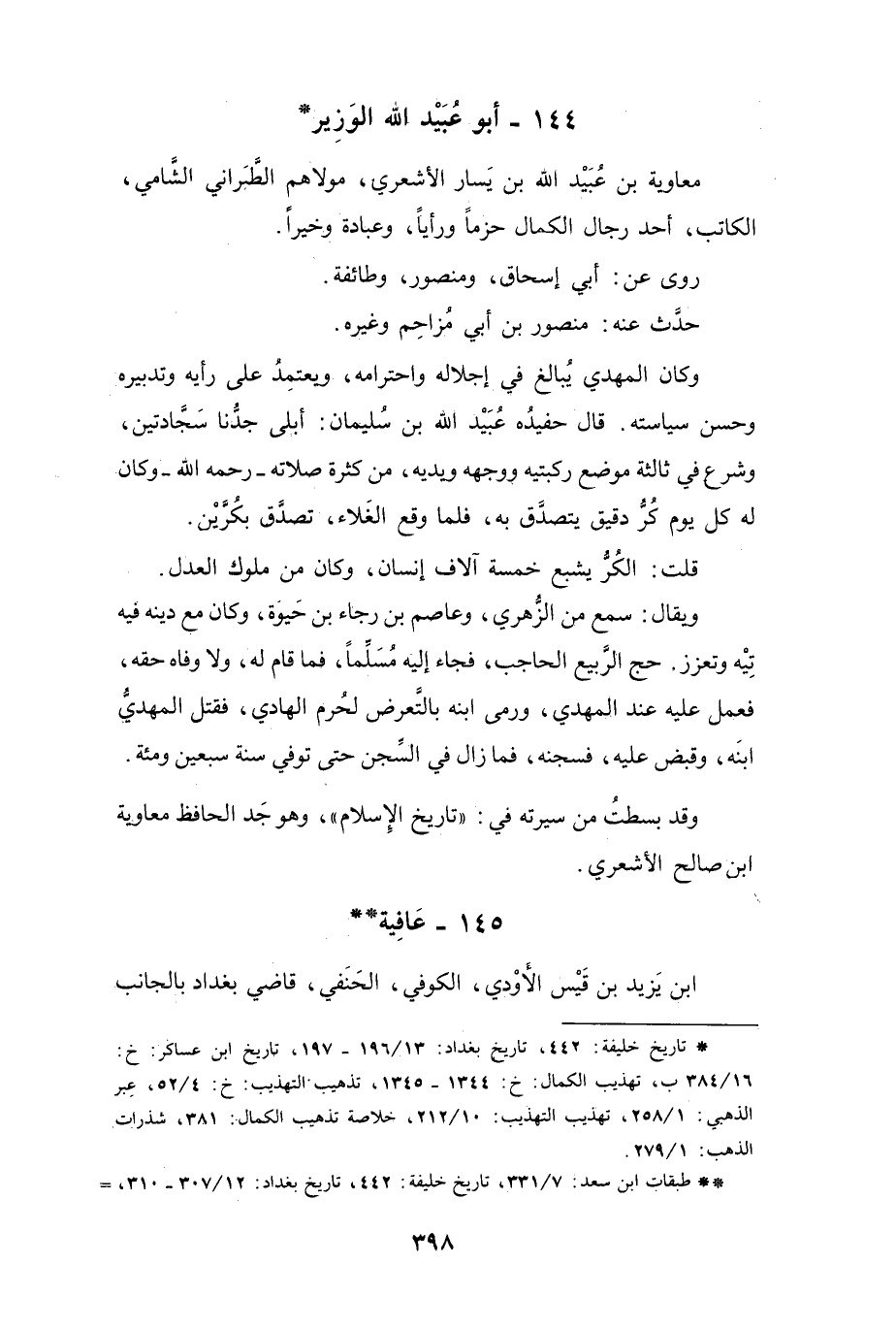 144 - أَبُو عُبَيْدِ اللهِ الوَزِيْرُ مُعَاوِيَةُ بنُ عُبَيْدِ اللهِ بنِ يَسَارٍ الأَشْعَرِيُّ مَوْلاَهُم *