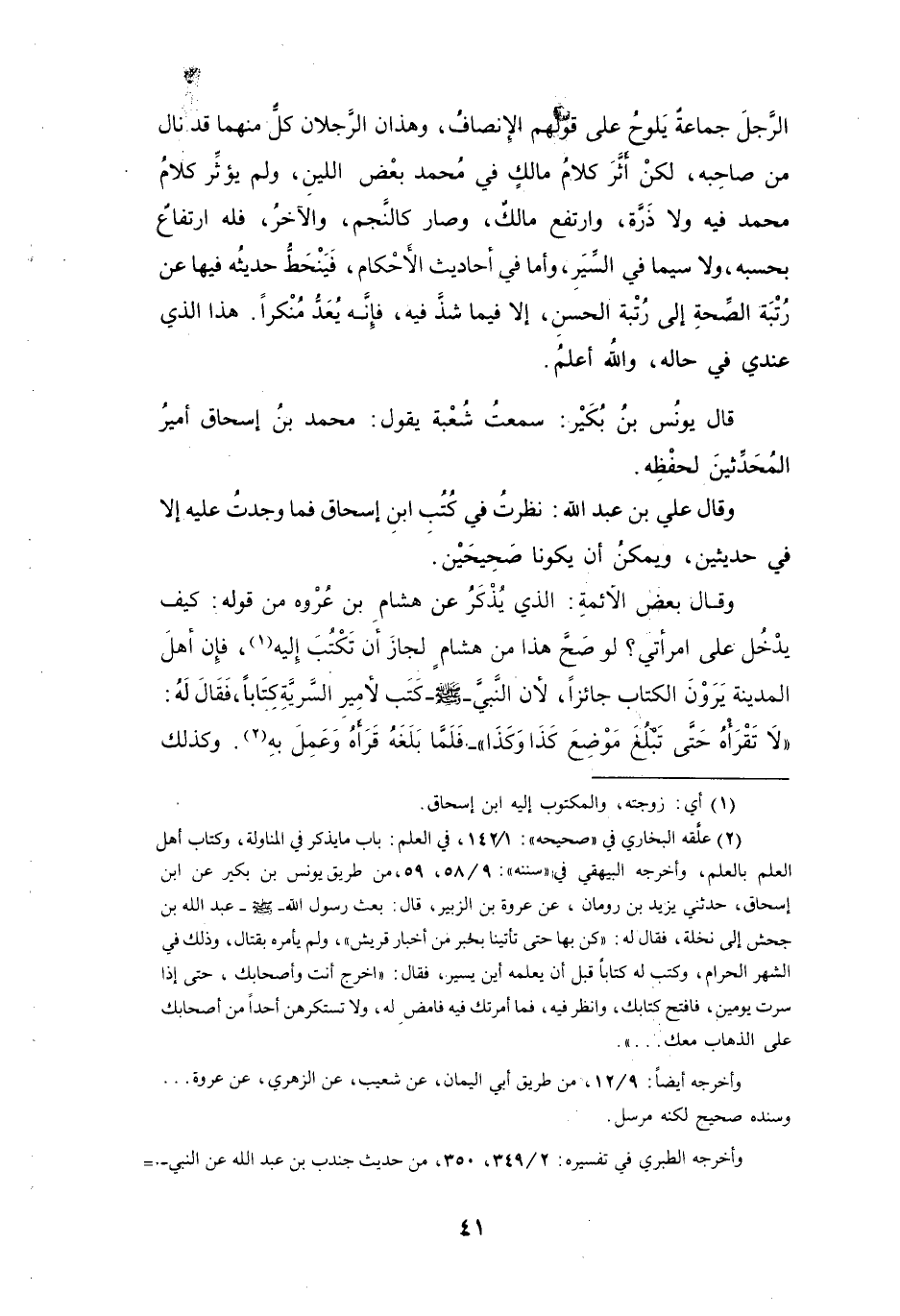 وَهَذَانِ الرَّجُلاَنِ كُلٌّ مِنْهُمَا قَدْ نَالَ مِنْ صَاحِبِه، لَكِنْ أَثَّرَ كَلاَمُ مَالِكٍ فِي مُحَمَّدٍ بَعْضَ اللِّيْنِ، وَلَمْ يُؤثِّرْ كَلاَمُ مُحَمَّدٍ فِيْهِ وَلاَ ذَرَّةٍ، وَارتَفَعَ مَالِكٌ، وَصَارَ كَالنَّجمِ، فَلَهُ ارْتفَاعٌ بِحَسْبِهِ، وَلاَ سِيَّمَا فِي السِّيَرِ، وَأَمَّا فِي أَحَادِيْثِ الأَحكَامِ، فَيَنحَطُّ حَدِيْثُه فِيْهَا عَنْ رُتْبَةِ الصِّحَّةِ إِلَى رُتْبَةِ الحَسَنِ، إِلاَّ فِيْمَا شَذَّ فِيْهِ، فَإِنَّهُ يُعَدُّ مُنْكَراً، هَذَا الَّذِي عِنْدِي فِي حَالِهِ - وَاللهُ أَعْلَمُ -.
