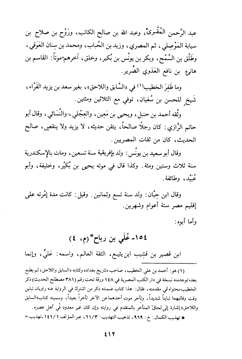 (1) هو: أحمد بن علي الخطيب، صاحب " تاريخ بغداد " وكتابه " السابق واللاحق " لم يطبع بعد، توجد منه نسخة في دار الكتب المصرية في 148 ورقة تحت رقم (381 مصطلح الحديث) ذكر الخطيب محتواه في مقدمته، فقال: هذا كتاب ضمنته ذكر من اشتراك في الرواية عنه راويان تباين وقت وفاتيهما تباينا شديدا، وتأخر موت أحدهما عن الآخر تأخرا بعيدا، وسميته كتاب " السابق واللاحق " إشارة إلى لحاق المتأخر بالمتقدم في روايته وإن كان غير معدود في أهل عصره.