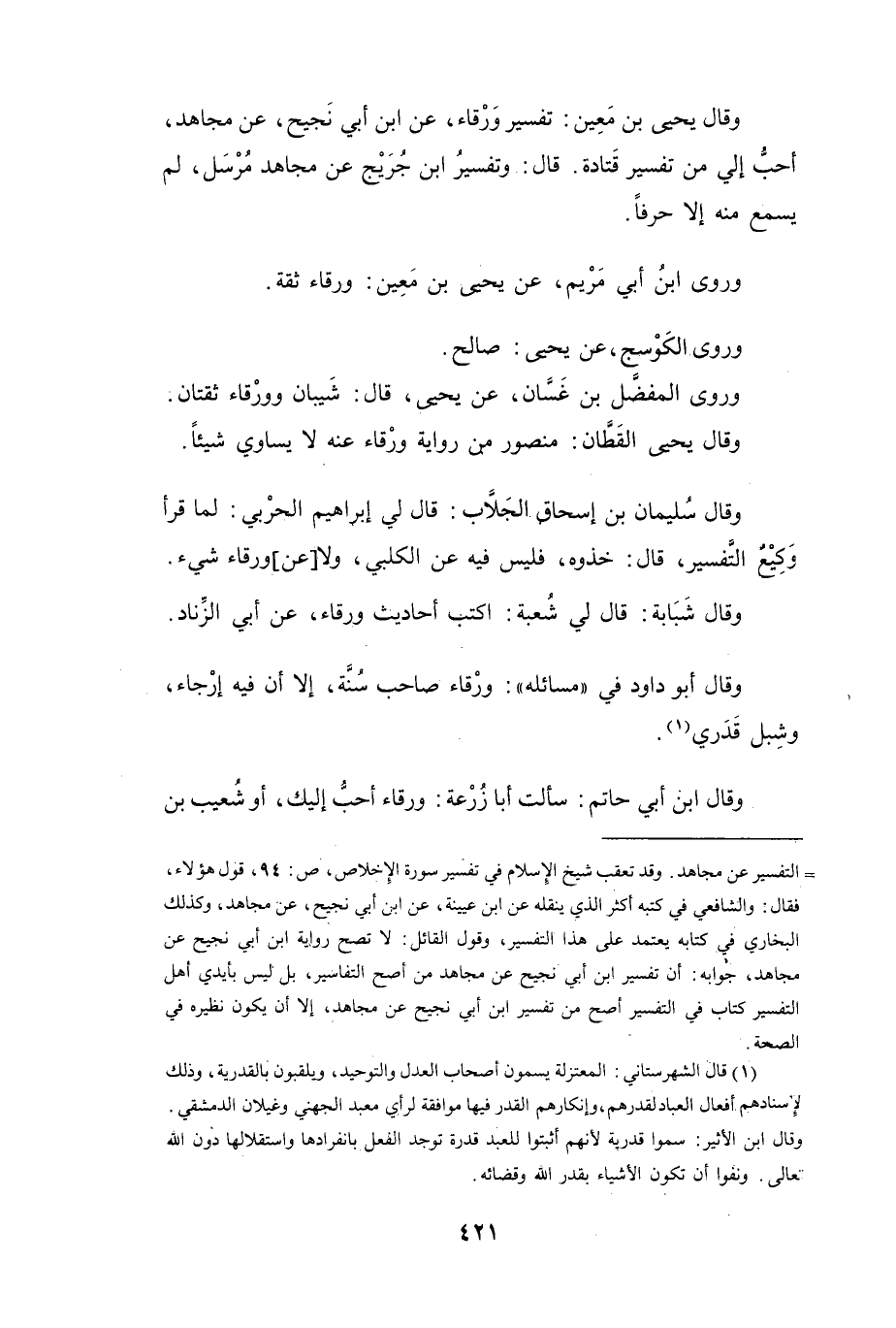 وقد تعقب شيخ الإسلام في تفسير سورة الاخلاص، ص: 94، قول هولاء، فقال: والشافعي في كتبه أكثر الذي ينقله عن ابن عيينة، عن ابن أبي نجيح، عن مجاهد، وكذلك البخاري في كتابه يعتمد على هذا التفسير، وقول القائل: لا تصح رواية ابن أبي نجيح عن مجاهد، جوابه: أن تفسير ابن أبي نجيح عن مجاهد من أصح التفاسير، بل ليس بأيدي أهل التفسير كتاب في التفسير أصح من تفسير ابن أبي نجيح عن مجاهد، إلا أن يكون نظيره في الصحة.
