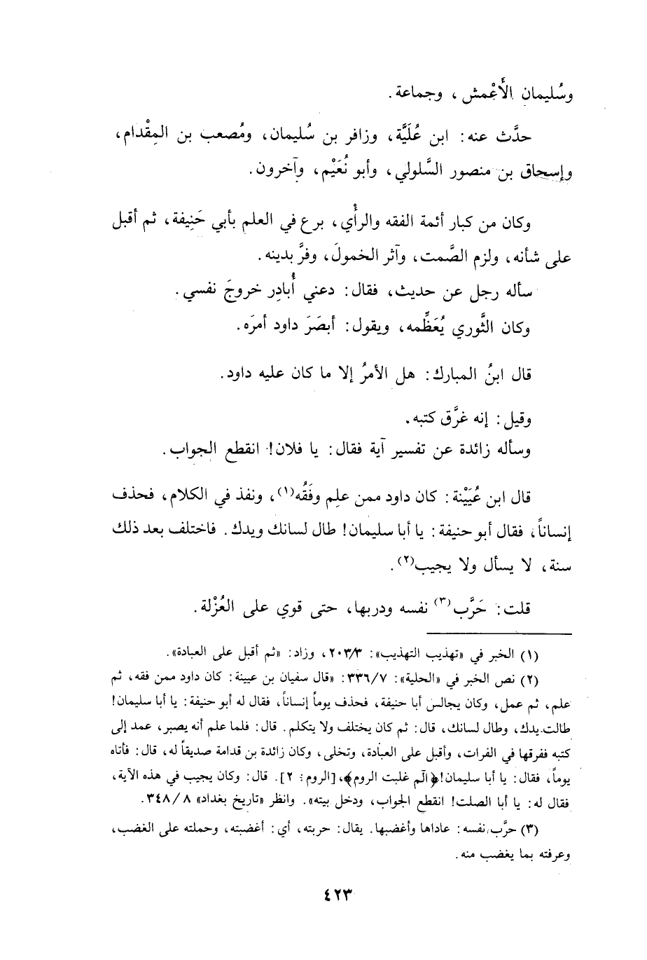(2) نص الخبر في " الحلية ": 7 / 336: " قال سفيان بن عيينة: كان داود ممن فقه، ثم علم، ثم عمل، وكان يجالس أبا حنيفة، فحذف يوما إنسانا، فقال له أبو حنيفة: يا أبا سليمان! طالت يدك، وطال لسانك، قال: ثم كان يختلف ولا يتكلم.
