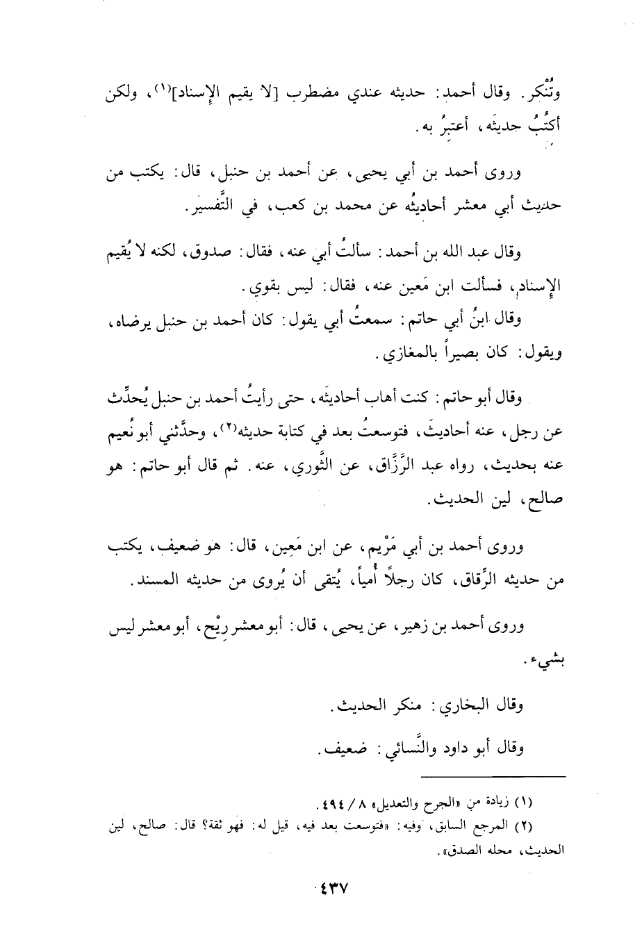 يُكتَبُ مِنْ حَدِيْثِ أَبِي مَعْشَرٍ أَحَادِيْثُه عَنْ مُحَمَّدِ بنِ كَعْبٍ فِي التَّفْسِيْرِ.