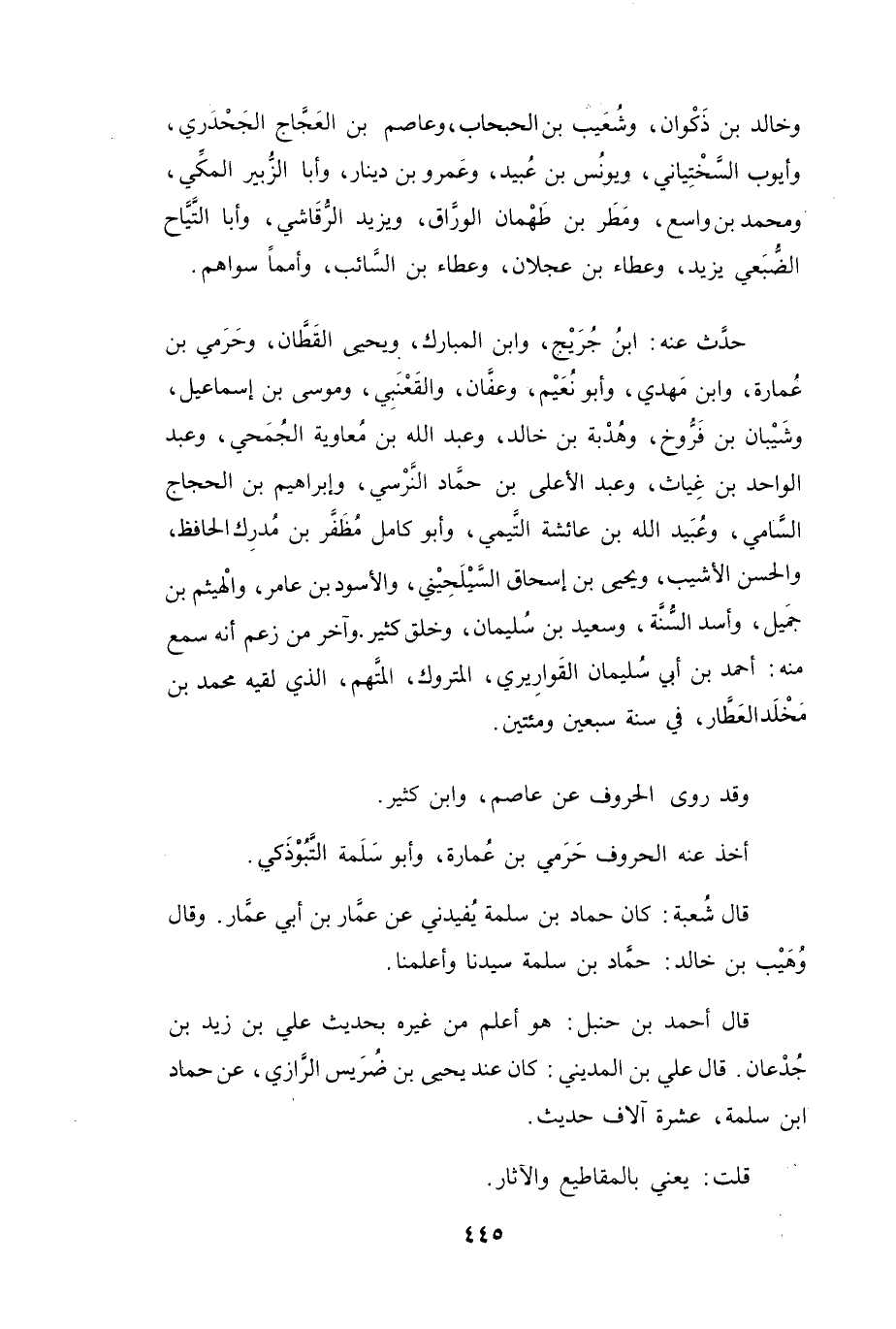 وَقَالَ وُهَيْبُ بنُ خَالِدٍ: حَمَّادُ بنُ سَلَمَةَ سَيِّدُنَا وَأَعْلَمُنَا.