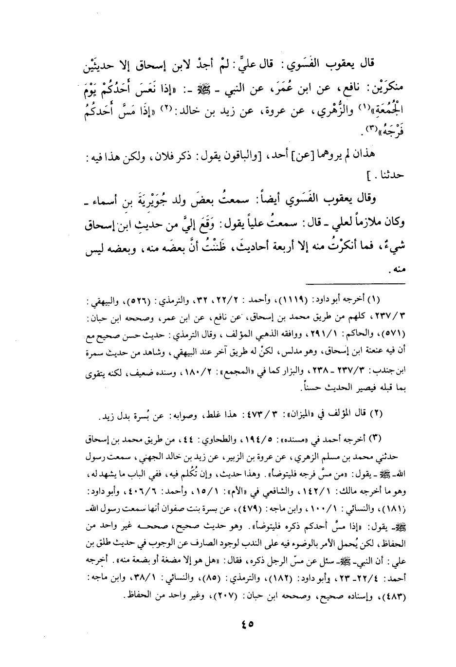 قَالَ يَعْقُوْبُ الفَسَوِيُّ: قَالَ عَلِيٌّ: لَمْ أَجِدْ لابْنِ إِسْحَاقَ إِلاَّ حَدِيْثَينِ مُنْكَرَيْنِ: