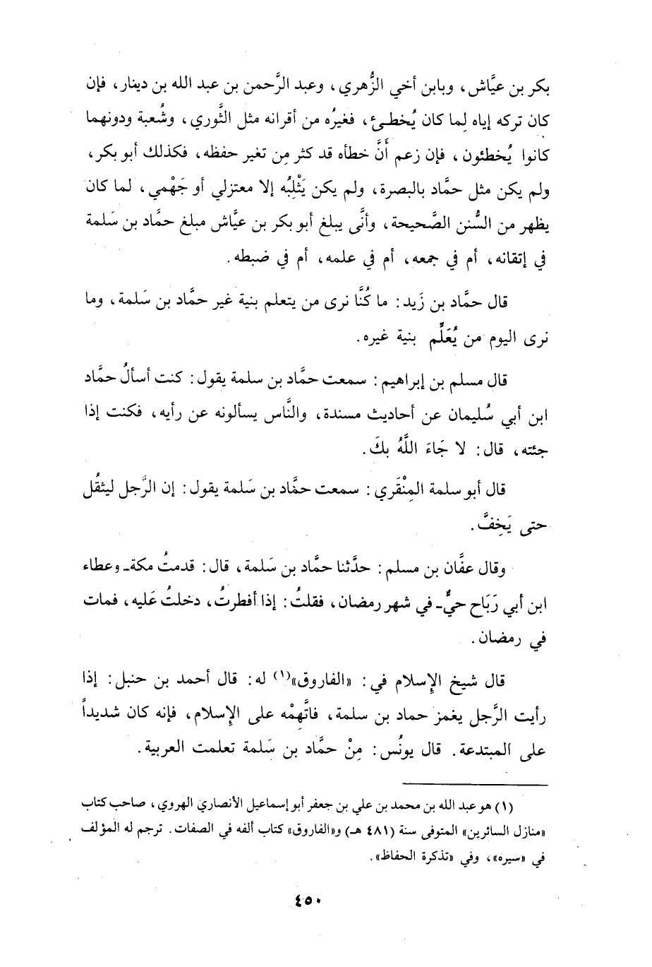 بَكْرٍ بنِ عَيَّاشٍ، وَبَابْنِ أَخِي الزُّهْرِيِّ، وَعَبْدِ الرَّحْمَنِ بنِ عَبْدِ اللهِ بنِ دِيْنَارٍ، فَإِنْ كَانَ تَرْكُه إِيَّاهُ لِمَا كَانَ يُخطِئُ، فَغَيْرُهُ مِنْ أَقْرَانِهِ مِثْلُ الثَّوْرِيِّ، وَشُعْبَةَ، وَدُوْنَهمَا كَانُوا يُخْطِئُوْنَ، فَإِنَّ زَعمَ أَنَّ خَطَأَهُ قَدْ كَثُرَ مِنْ تَغَيُّرِ حِفْظِه، فَكَذَلِكَ أَبُو بَكْرٍ، وَلَمْ يَكُنْ مِثْلَ حَمَّادٍ بِالبَصْرَةِ، وَلَمْ يَكُنْ يَثْلِبْهُ إِلاَّ مُعْتَزِلِيٌّ أَوْ جَهْمِيٌّ، لِمَا كَانَ يُظْهِرُ مِنَ السُّنَنِ الصَّحِيْحَةِ، وَأَنَّى يَبلُغُ أَبُو بَكْرٍ بنُ عَيَّاشٍ مَبْلَغَ حَمَّادِ بنِ سَلَمَةَ فِي إِتْقَانِهِ، أَمْ فِي جَمْعِهِ، أَمْ فِي عِلْمِهِ، أَمْ فِي ضَبْطِهِ.