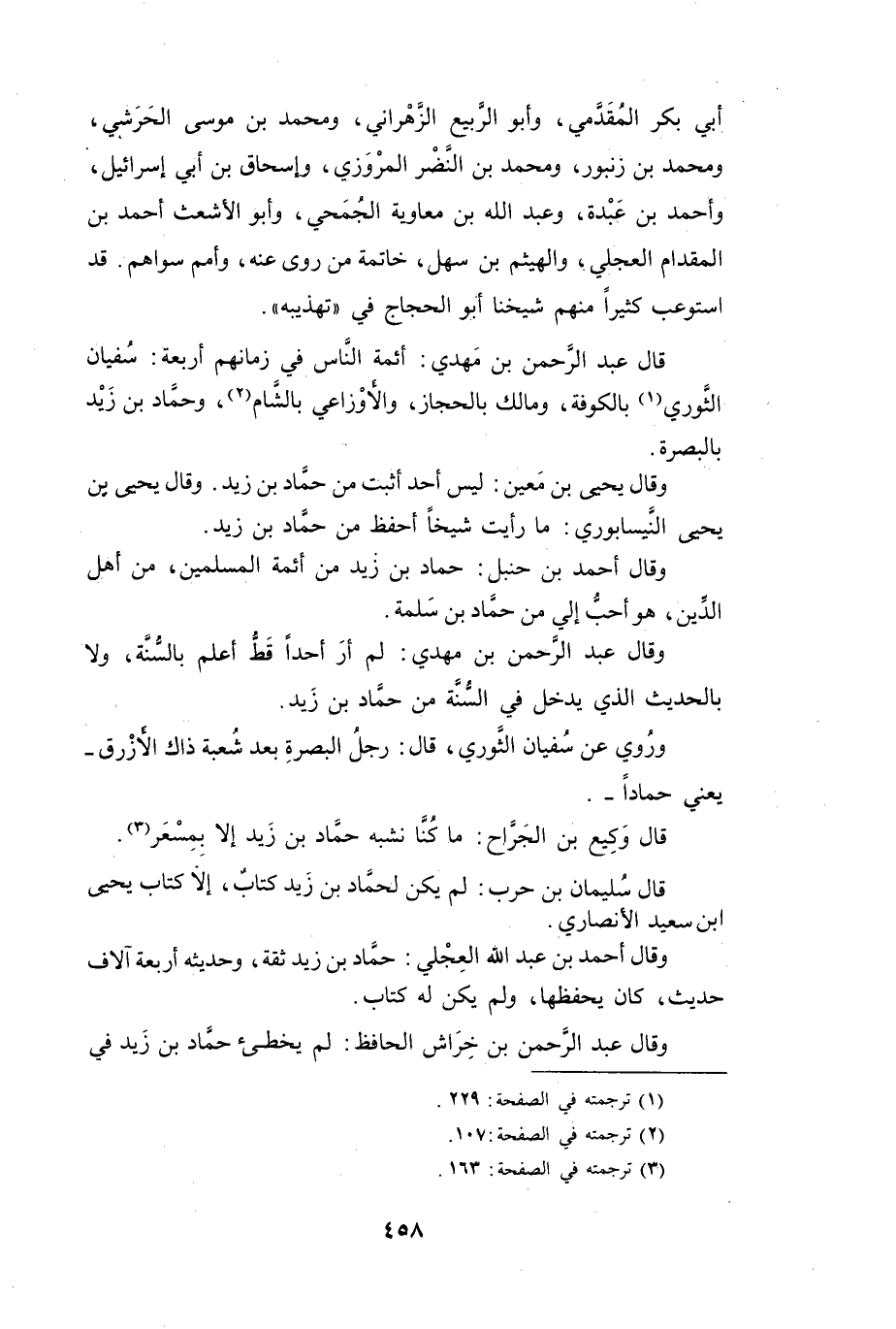 قَالَ عَبْدُ الرَّحْمَنِ بنُ مَهْدِيٍّ: أَئِمَّةُ النَّاسِ فِي زَمَانِهِم أَرْبَعَةٌ: سُفْيَانُ الثَّوْرِيُّ (1) بِالكُوْفَةِ، وَمَالِكٌ بِالحِجَازِ، وَالأَوْزَاعِيُّ بِالشَّامِ (2) ، وَحَمَّادُ بنُ زَيْدٍ بِالبَصْرَةِ.