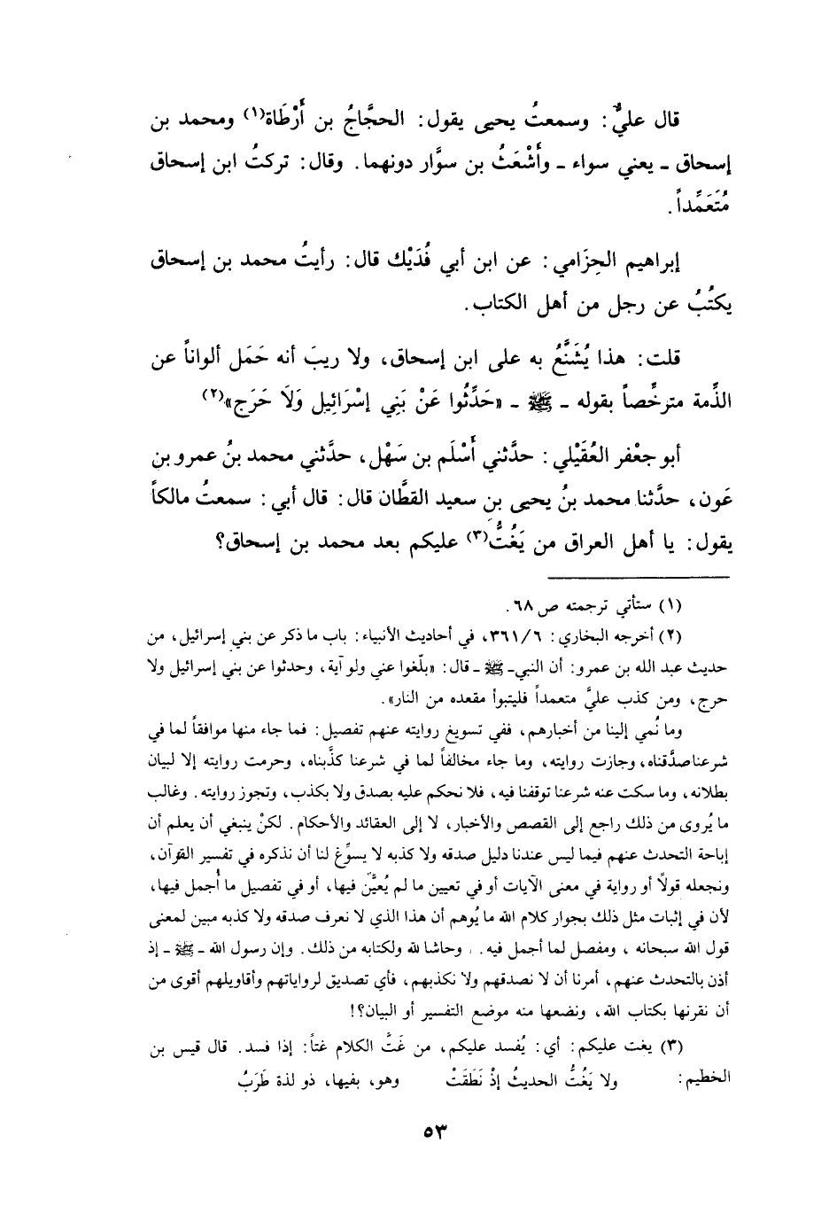 قُلْتُ: هَذَا يُشَنَّعُ بِهِ عَلَى ابْنِ إِسْحَاقَ، وَلاَ رَيْبَ أَنَّهُ حَمَلَ أَلوَاناً عَنِ الذِّمَّةِ مُتَرَخِّصاً بِقَوْلِهِ -صَلَّى اللَّهُ عَلَيْهِ وَسَلَّمَ-: (حَدِّثُوا عَنْ بَنِي إِسْرَائِيْلَ وَلاَ حَرَجَ (2)) .