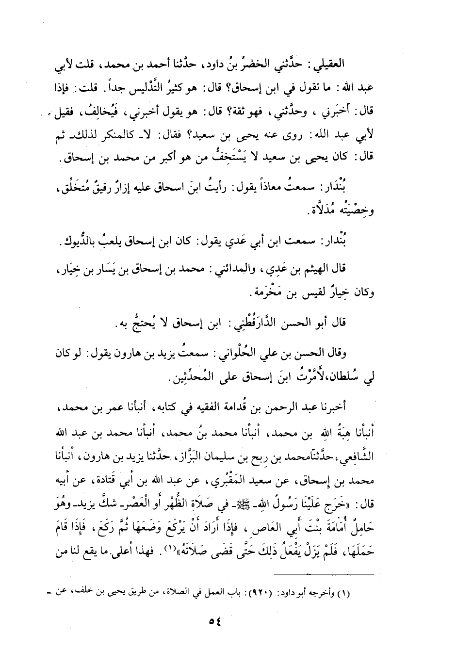 قَالَ أَبُو الحَسَنِ الدَّارَقُطْنِيُّ: ابْنُ إِسْحَاقَ لاَ يُحْتَجُّ بِهِ.