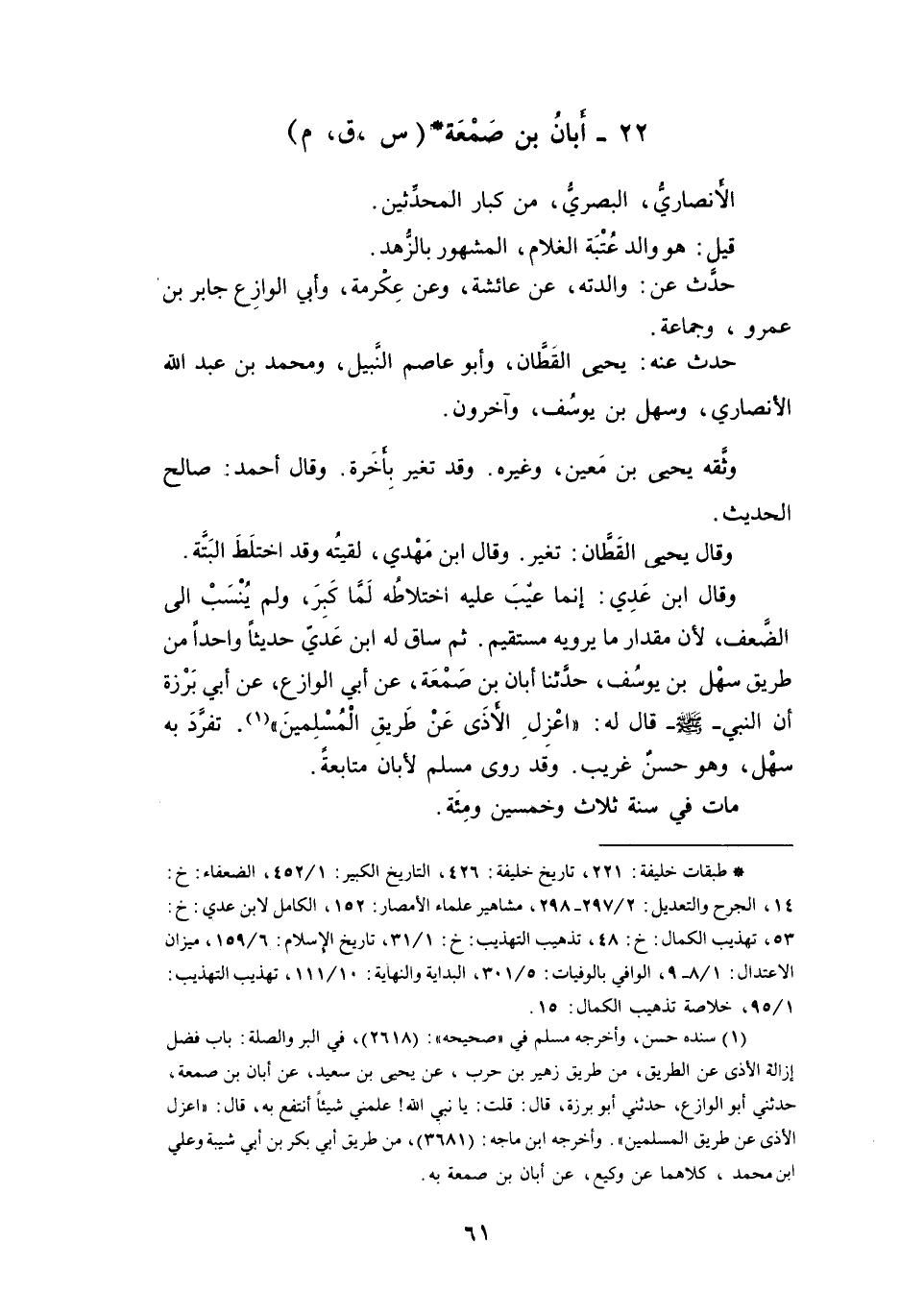 22 - أَبَانُ بنُ صَمْعَةَ الأَنْصَارِيُّ البَصْرِيُّ * (س، ق، م)