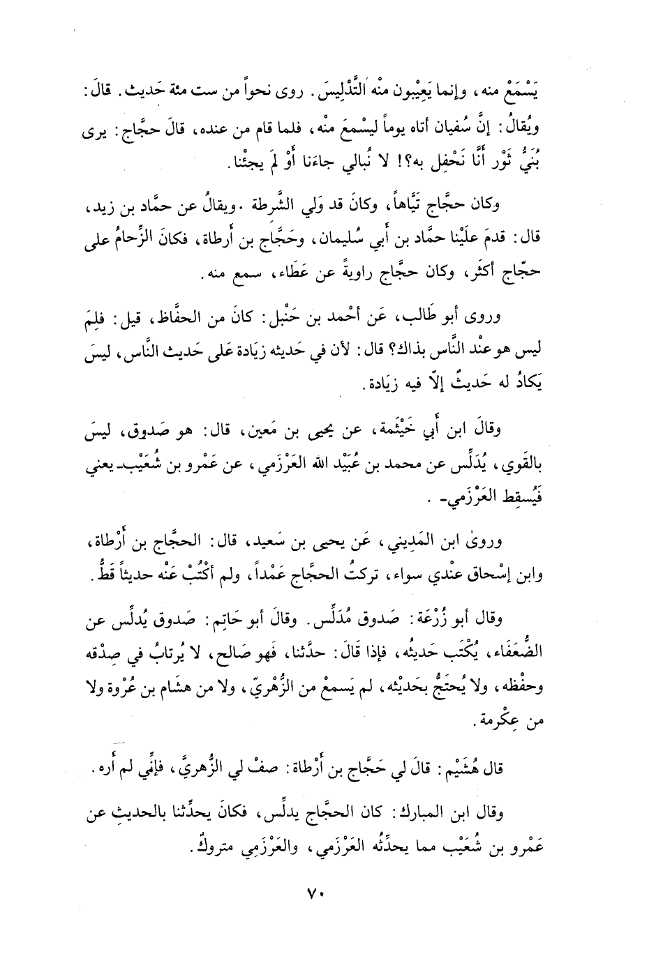 الحَجَّاجُ بنُ أَرْطَاةَ، وَابْنُ إِسْحَاقَ عِنْدِي سَوَاءٌ، تَرَكتُ الحَجَّاجَ عَمداً، وَلَمْ أَكْتُبْ عَنْهُ حَدِيْثاً قَطُّ.