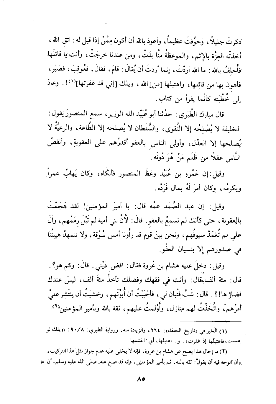وَقِيْلَ: إِنَّ عَمْرَو بنَ عُبَيْدٍ وَعَظَ المَنْصُوْرَ، فَأَبكَاهُ، وَكَانَ يَهَابُ عَمْراً، وَيُكرِمُهُ، وَكَانَ أَمَرَ لَهُ بِمَالٍ، فَرَدَّهُ.