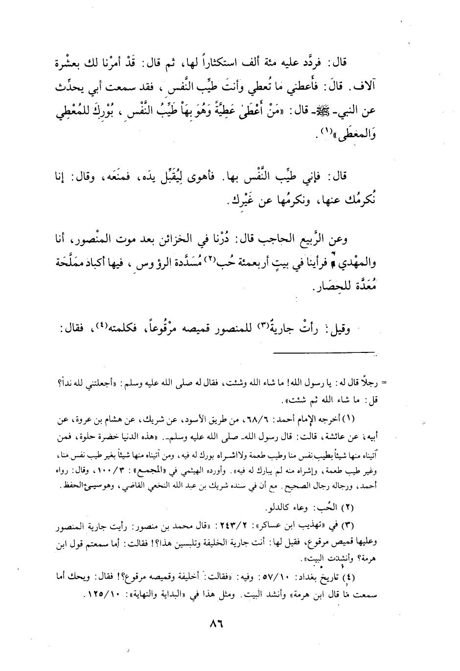 (4) تاريخ بغداد: 10 / 57: وفيه: " فقالت: أخليفة وقميصه مرقوع؟ ! فقال: ويحك أما سمعت ما قال ابن هرمة " وأنشد البيت.
