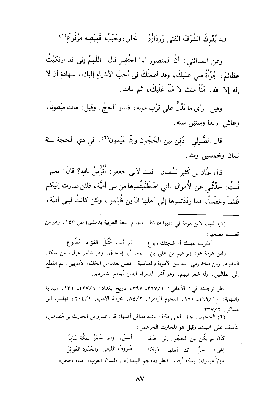 وَعَنِ المَدَائِنِيِّ: أَنَّ المَنْصُوْرَ لَمَّا احْتُضِرَ، قَالَ: