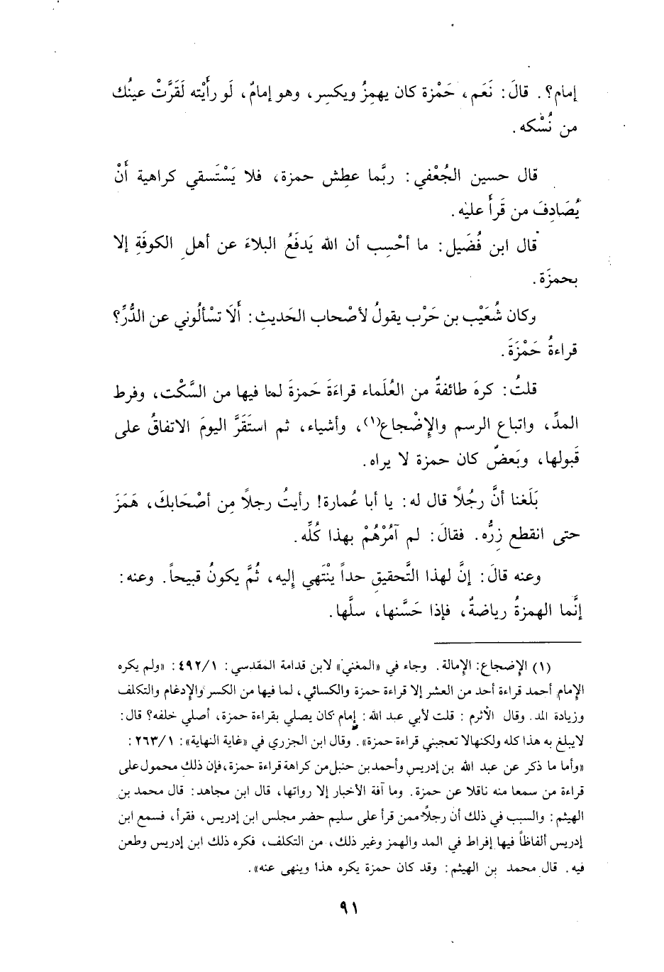 وقال ابن الجزري في " غاية النهاية: 1 / 263: " وأما ما ذكر عن عبد الله بن إدريس وأحمد بن حنبل من كراهة قراءة حمزة، فإن ذلك محمول على قراءة من سمعا منه ناقلا عن حمزة.