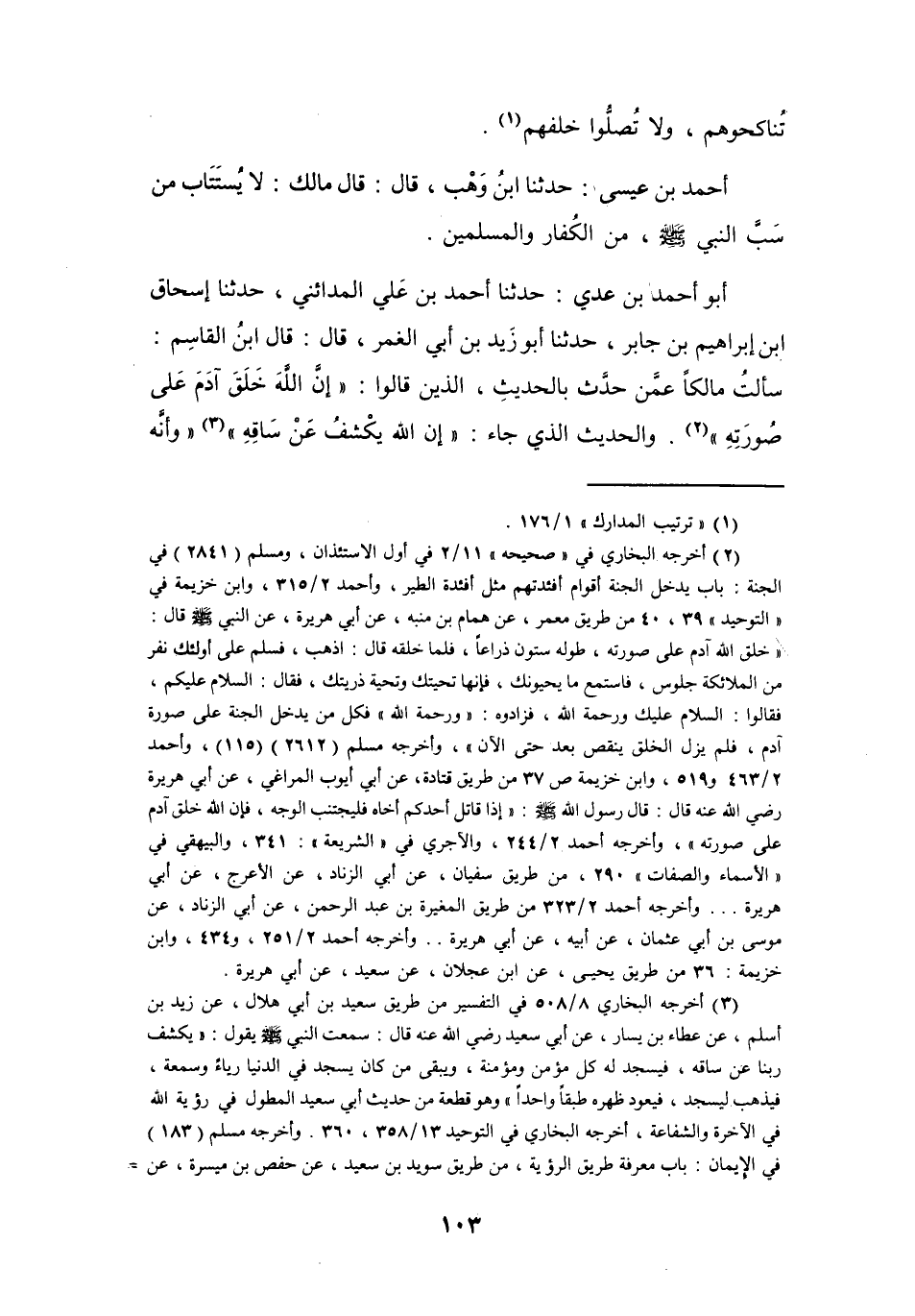 قَالَ ابْنُ القَاسِمِ: سَأَلْتُ مَالِكاً عَمَّنْ حَدَّثَ بِالحَدِيْثِ: الَّذِيْنَ قَالُوا: (إِنَّ اللهَ خَلَقَ آدَمَ عَلَى صُوْرَتِهِ (2)) ، وَالحَدِيْثِ الَّذِي جَاءَ: (إِنَّ اللهَ يَكْشِفُ عَنْ سَاقِهِ (3)) ، (وَأَنَّهُ