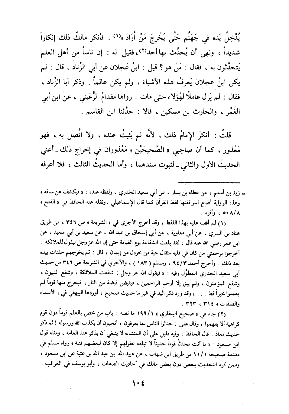 قُلْتُ: أَنْكَرَ الإِمَامُ ذَلِكَ، لأَنَّهُ لَمْ يَثبُتْ عِنْدَهُ، وَلاَ اتَّصَلَ بِهِ، فَهُوَ مَعْذُورٌ، كَمَا أَنَّ صَاحِبَي (الصَّحِيْحَيْنِ) مَعْذُورَانِ فِي إِخرَاجِ ذَلِكَ - أَعْنِي: الحَدِيْثَ الأَوَّلِ وَالثَّانِي - لِثُبُوتِ سَنَدِهِمَا، وَأَمَّا الحَدِيْثُ الثَّالِثُ، فَلاَ أَعْرِفُه
