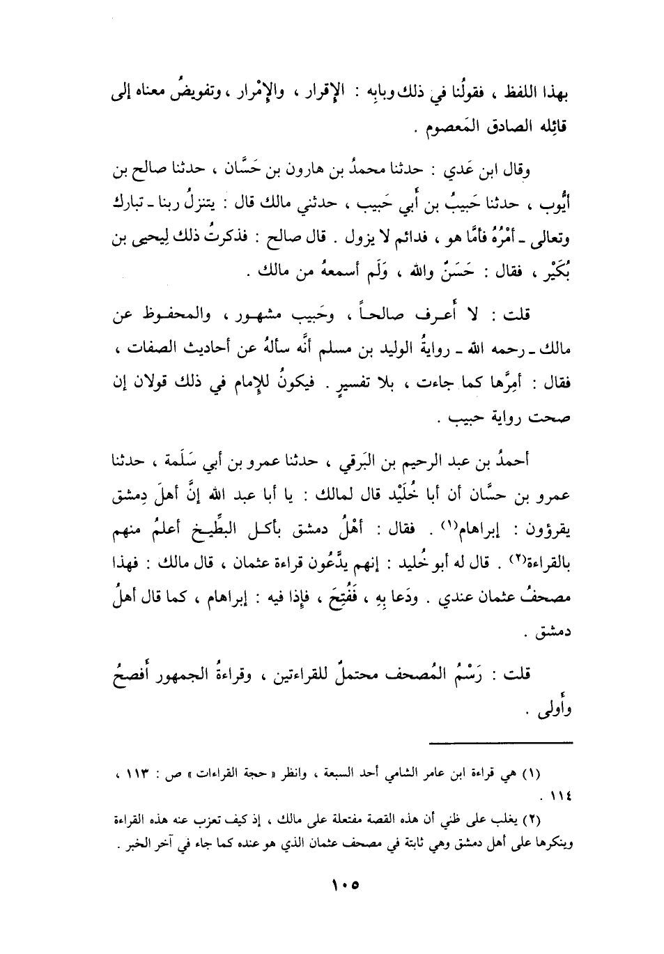 (2) يغلب على ظني أن هذا القصة مفتعلة على مالك، إذ كيف تعزب عنه هذه القراءة وينكرها على أهل دمشق وهي ثابتة في مصحف عثمان الذي هو عنده كما جاء في آخر الخبر.