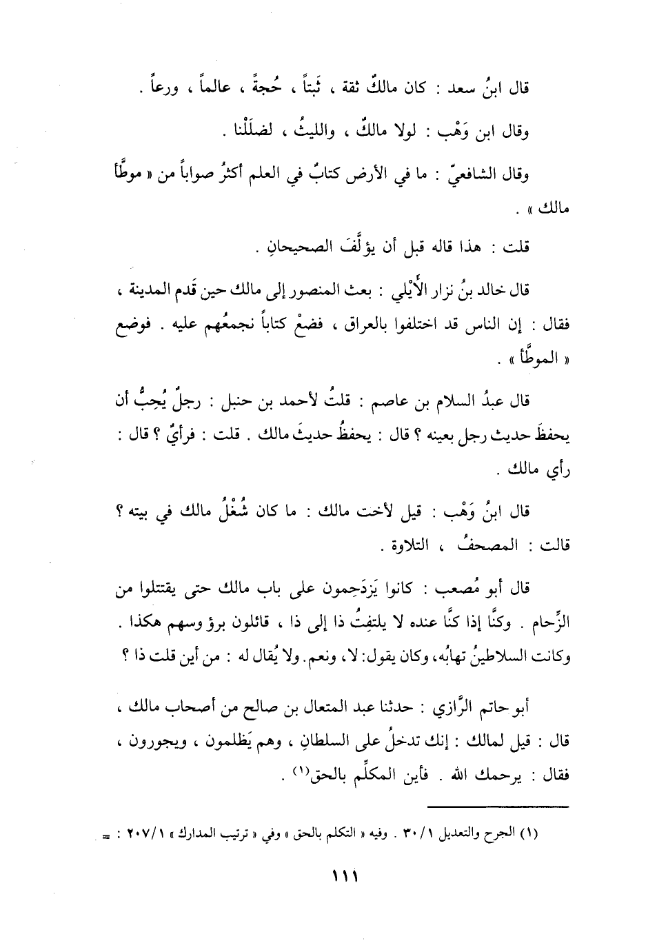 وَقَالَ الشَّافِعِيُّ: مَا فِي الأَرْضِ كِتَابٌ فِي العِلْمِ أَكْثَرُ صَوَاباً مِنْ (مُوَطَّأِ مَالِكٍ) .