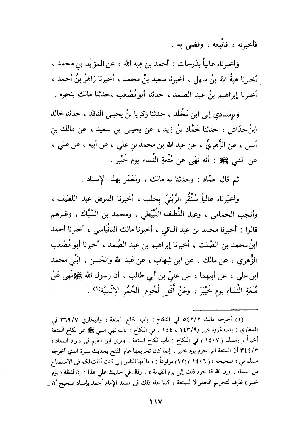 وَأَخْبَرَنَاهُ عَالِياً بِدَرَجَاتٍ: أَحْمَدُ بنُ هِبَةِ اللهِ، عَنِ المُؤَيَّدِ بنِ مُحَمَّدٍ، أَخْبَرَنَا هِبَةُ اللهِ بنُ سَهْلٍ، أَخْبَرَنَا سَعِيْدُ بنُ مُحَمَّدٍ، أَخْبَرَنَا زَاهِرُ بنُ أَحْمَدَ، أَخْبَرَنَا إِبْرَاهِيْمُ بنُ عَبْدِ الصَّمَدِ، حَدَّثَنَا أَبُو مُصْعَبٍ، حَدَّثَنَا مَالِكٌ بِنَحْوِهِ.