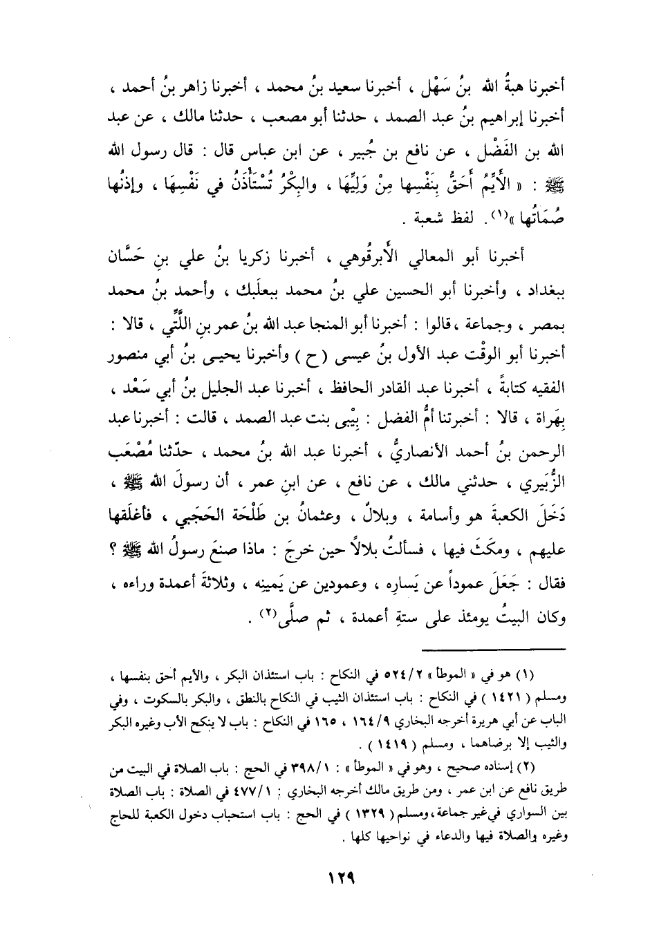(1) هو في " الموطأ " 2 / 524 في النكاح: باب استئذان البكر، والايم أحق بنفسها، ومسلم (1421) في النكاح: باب استئذان الثيب في النكاح بالنطق، والبكر بالسكوت، وفي الباب عن أبي هريرة أخرجه البخاري 9 / 164، 165 في النكاح: باب لا ينكح الاب وغيره البكر والثيب إلا برضاهما، ومسلم (1419) .