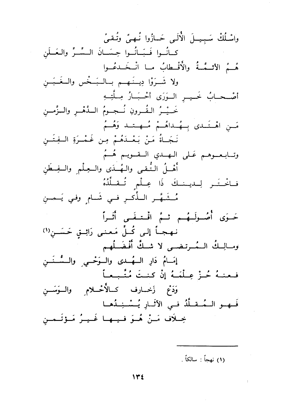 وَاسْلُكْ سَبِيْلَ الأُلَى حَازُوا نُهَىً وَتُقَىً ... كَانُوا فَبَانُوا حِسَانَ السِّرِّ وَالعَلَنِ