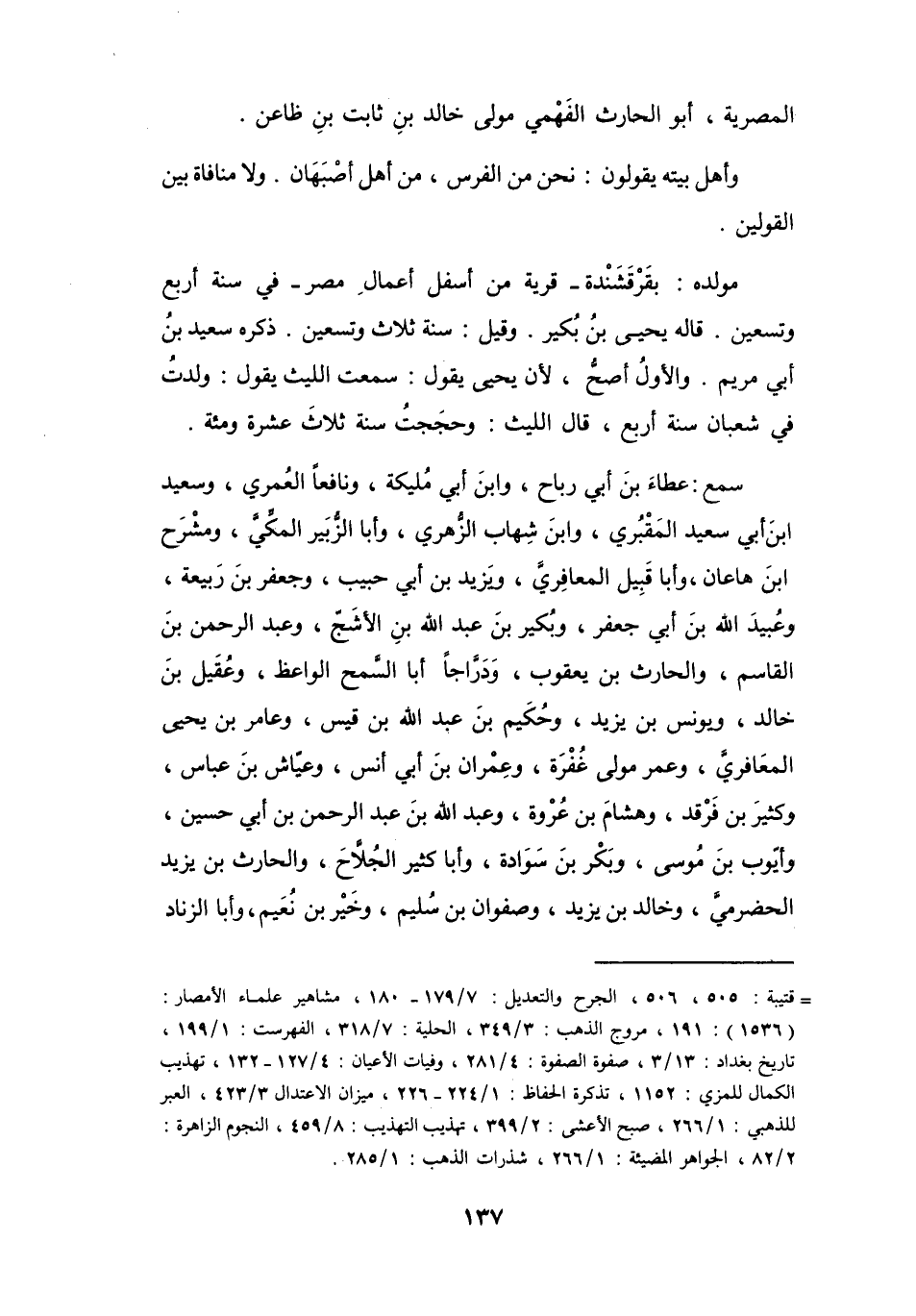 المِصْرِيَّةِ، أَبُو الحَارِثِ الفَهْمِيُّ، مَوْلَى خَالِدِ بنِ ثَابِتِ بنِ ظَاعِنٍ.