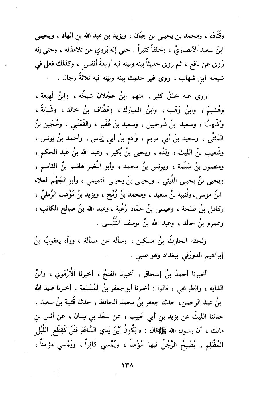 وَقَتَادَةَ، وَمُحَمَّدَ بنَ يَحْيَى بنِ حَبَّانَ، وَيَزِيْدَ بنَ عَبْدِ اللهِ بنِ الهَادِ، وَيَحْيَى بنَ سَعِيْدٍ الأَنْصَارِيَّ، وَخَلْقاً كَثِيْراً.