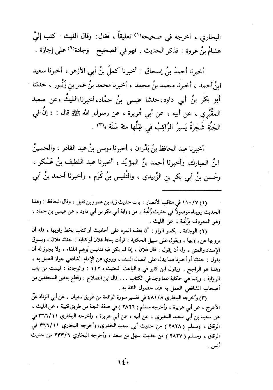 (2) الوجادة، بكسر الواو: أن يقف المرء على أحاديث أو كتاب بخط راويها، فله أن يرويها عن راويها، ويقول على سبيل الحكاية: قرأت بخط فلان أو كتابه: حدثنا فلان، ويسوق الإسناد والمتن، وله أن يقول: قال فلان، إذا لم يكن فيه تدليس يوهم اللقاء، ولا يجوز له أن يقول: حدثنا أو أخبرنا مما يدل على اتصال السند، وروي عن الامام الشافعي جواز العمل به، وهذا هو الراجح.
