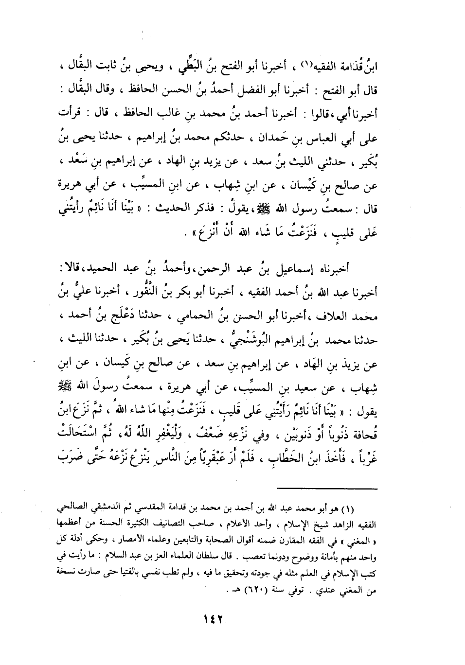 (1) هو أبو محمد عبد الله بن أحمد بن محمد بن قدامة المقدسي ثم الدمشقي الصالحي الفقيه الزاهد شيخ الإسلام، وأحد الاعلام، صاحب التصانيف الكثيرة الحسنة من أعظمها " المغني " في الفقه المقارن ضمنه أقوال الصحابة والتابعين وعلماء الأمصار، وحكى أدلة كل واحد منهم بأمانة ووضوح ودونما تعصب.