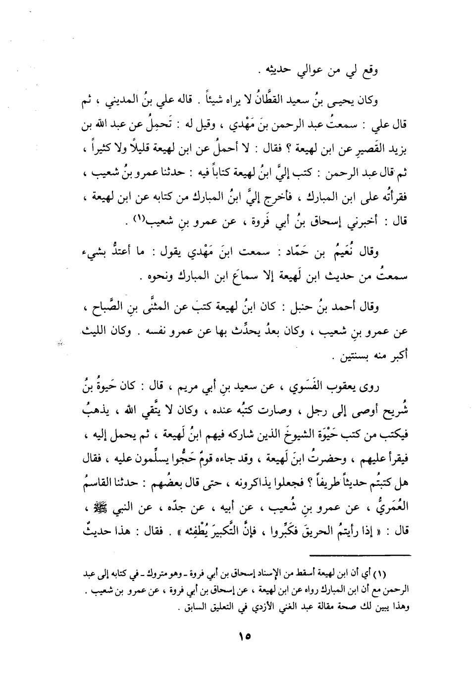 (1) أي أن ابن ليهعة أسقط من الإسناد إسحاق بن أبي فروة وهو متروك - في كتابه إلى عبد الرحمن مع أن ابن المبارك رواه عن ابن ليهعة، عن إسحاق بن أبي فروة، عن عمرو بن شعيب.