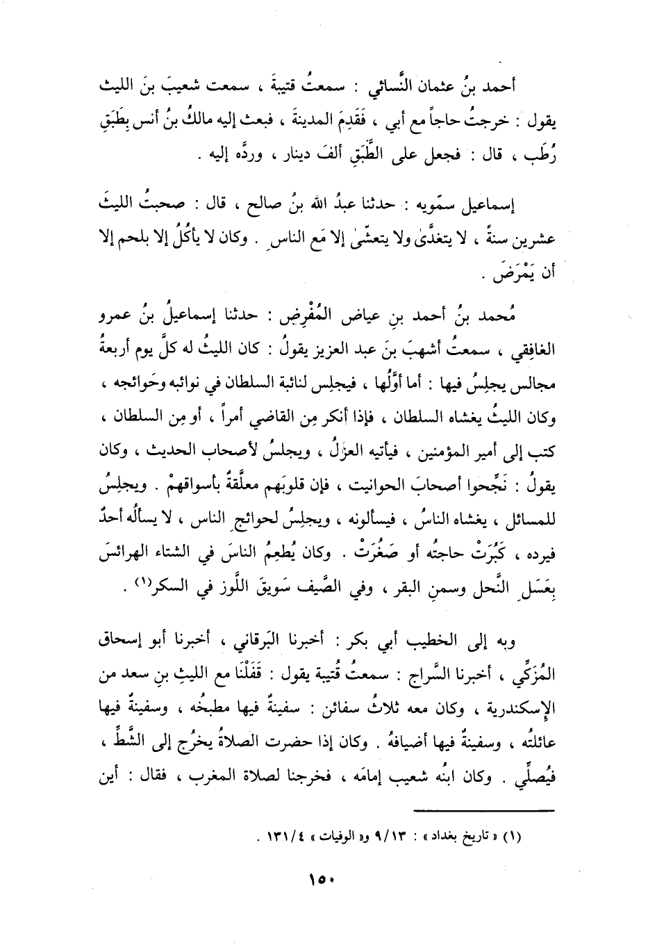 صَحِبتُ اللَّيْثَ عِشْرِيْنَ سَنَةً، لاَ يَتَغَدَّى وَلاَ يَتَعَشَّى إِلاَّ مَعَ النَّاسِ، وَكَانَ لاَ يَأْكُلُ إِلاَّ بِلَحمٍ إِلاَّ أَنْ يَمْرَضَ.