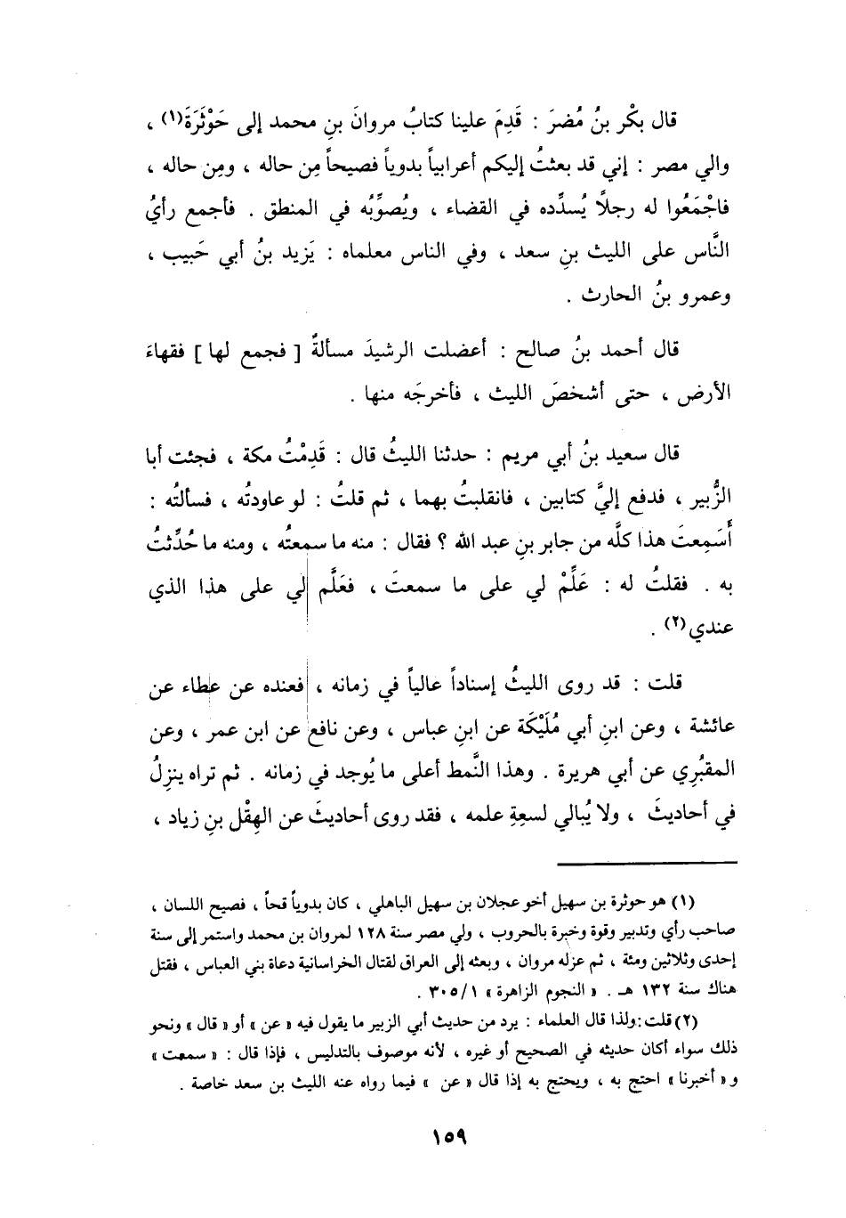 قَالَ بَكْر بنُ مُضَرَ: قَدِمَ عَلَيْنَا كِتَابُ مَرْوَانَ بنِ مُحَمَّدٍ إِلَى حَوْثَرَةَ (1) وَالِي مِصْرَ: