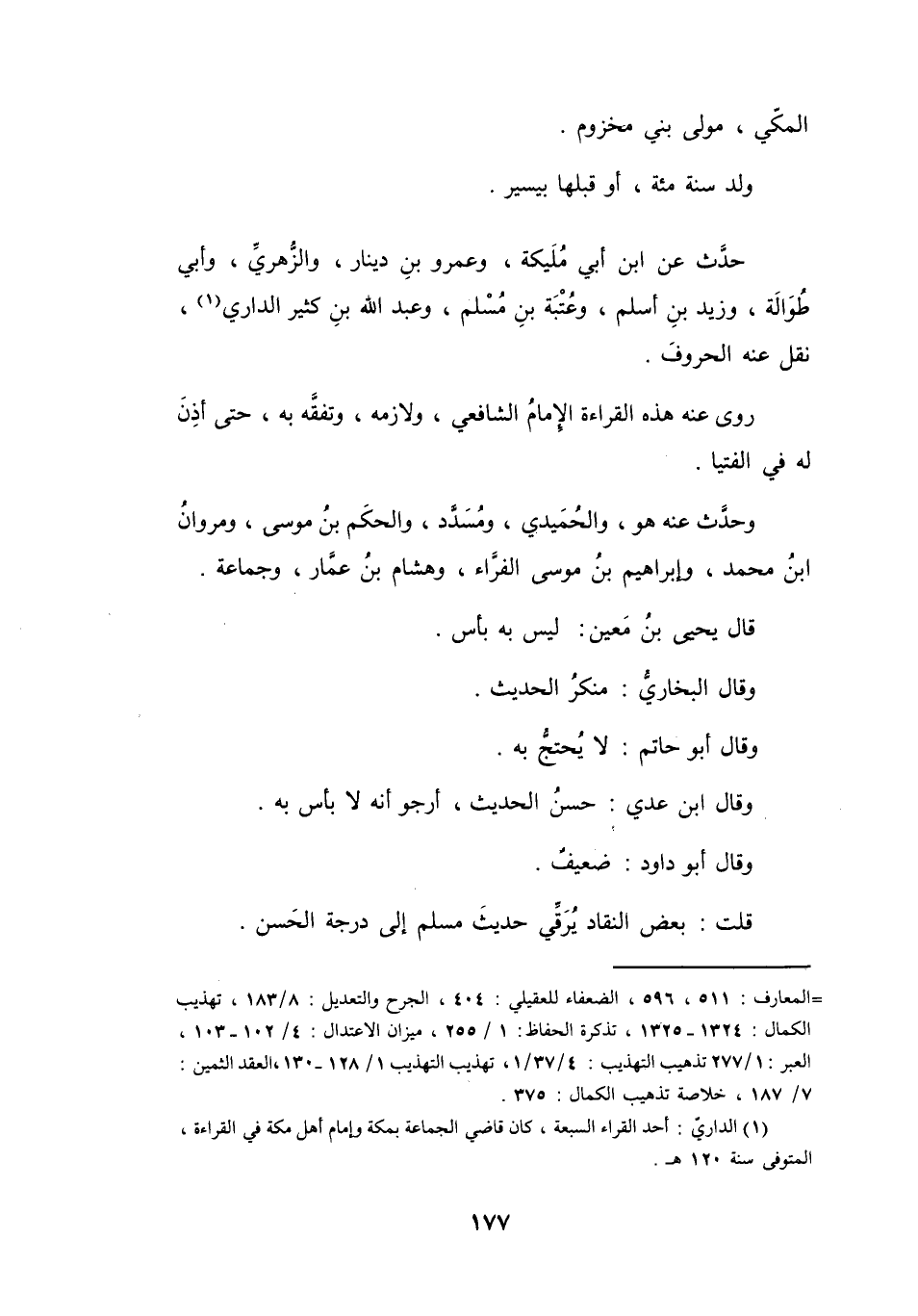 (1) الداري: أحد القراء السبعة، كان قاضي الجماعة بمكة وإمام أهل مكة في القراءة، المتوفى سنة 120 هـ.