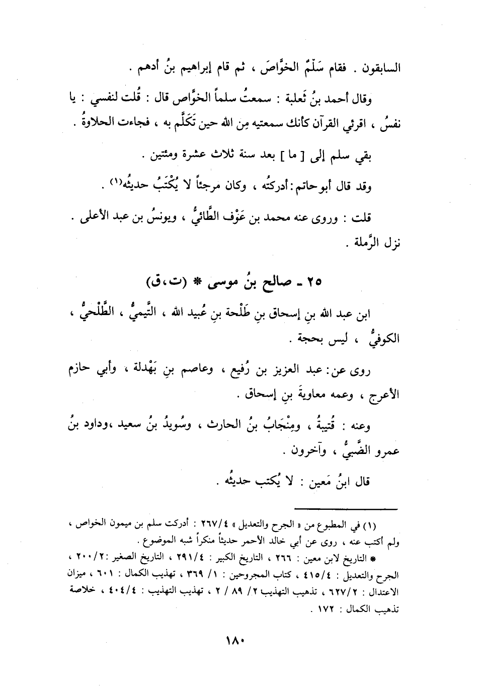 (1) في المطبوع من " الجرح والتعديل " 4 / 267: أدركت سلم بن ميمون الخواص، ولم أكتب عنه، روى عن أبي خالد الاحمر حديثا منكر شبه الموضوع.